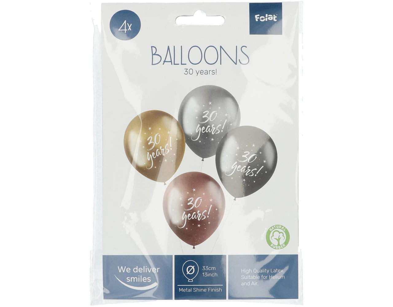 Ballonnen Shimmer ’30 Years!’ Electrum 33cm – 4 stuks. Inhoud: 4 latex ballonnen. Kleur: Meerkleurig. Bijvoorbeeld te gebruiken tijdens de volgende feestgelegenheid/feestgelegenheden: Verjaardag en Jubileum. Elke ballon is 13 inch/33 cm. Het artikel is gemaakt van latex.
