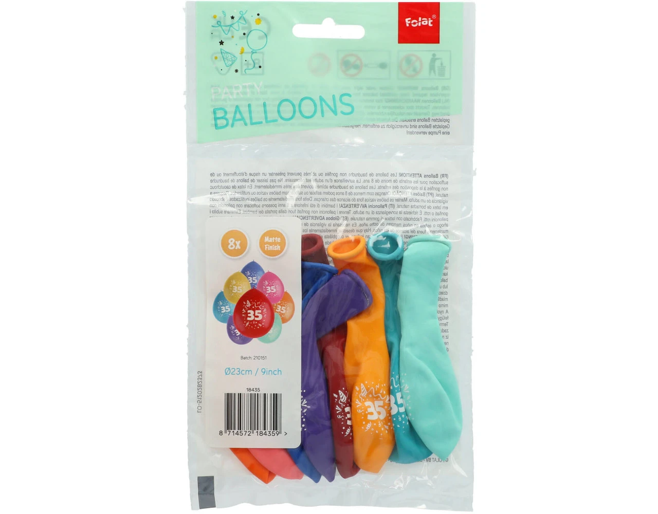 Ballonnen Color Pop 35 Jaar 23cm – 8 stuks. Inhoud: 8 latex ballonnen. Kleur: Meerkleurig. Bijvoorbeeld te gebruiken tijdens de volgende feestgelegenheid/feestgelegenheden: Verjaardag en Jubileum. Elke ballon is 9 inch/23 cm. Het artikel is gemaakt van latex.