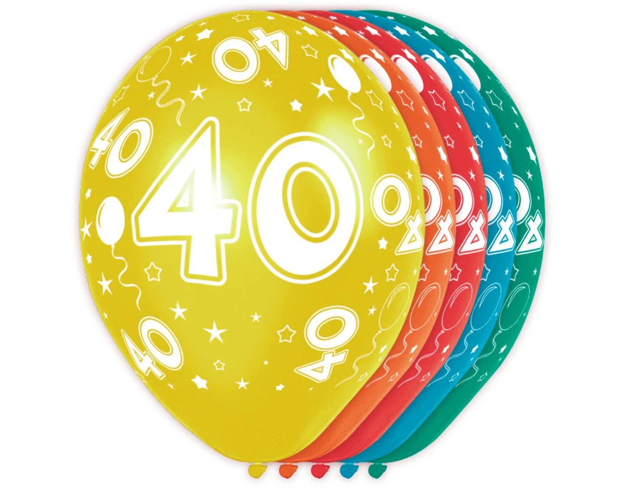 40 Jaar Verjaardag Ballonnen 5 stuks. Inhoud: 5 latex ballonnen. Bijvoorbeeld te gebruiken tijdens de volgende feestgelegenheid/feestgelegenheden: verjaardag, jubileum. Elke ballon is 12 inch/30 cm. Het artikel is gemaakt van latex.