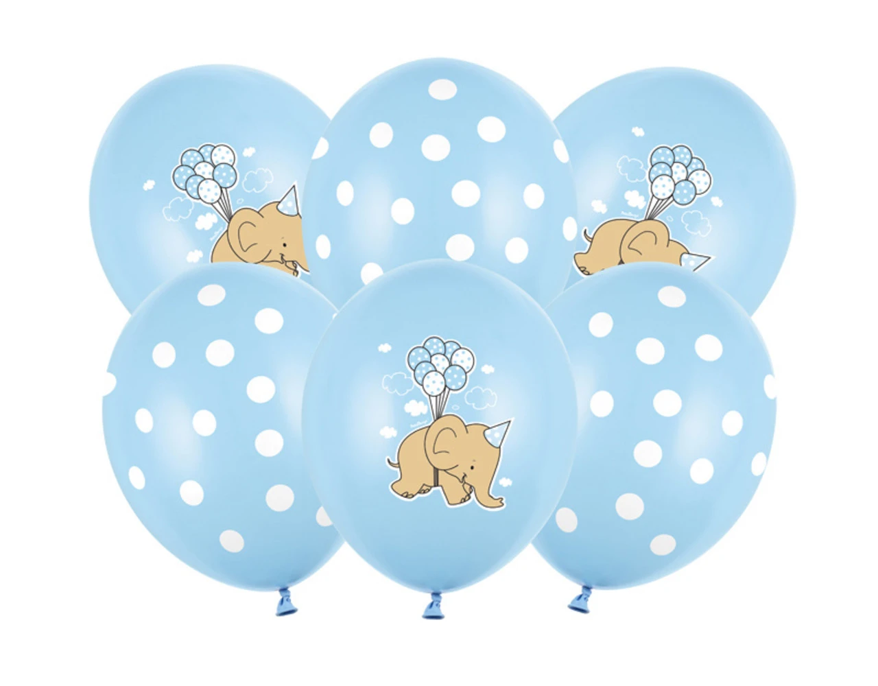 Sterke Ballonnen, Olifant, Pastel Baby Blauw Mix, de set bevat ballonnen met dubbelzijdige opdruk Olifant en witte vijfzijdige opdruk Dots.
