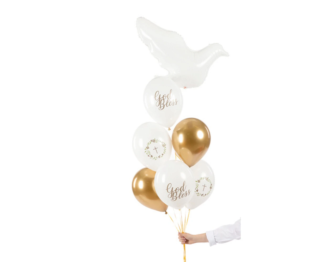 Sterke Ballonnen God Bless met opdruk, set bevat 6 ballonnen (2 in pastel Pure White kleur met goud opdruk, 2 in pastel Pure White kleur met goud en olijf opdruk en 2 in Glossy goud kleur) , diameter ca. 30 cm.