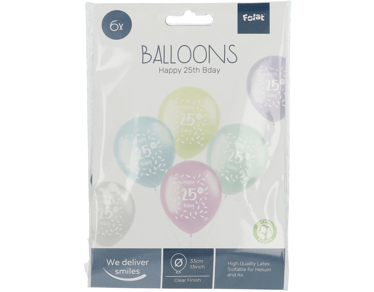 Ballonnen Pastel 25 Jaar Meerkleurig 33cm – 6 stuks. Inhoud: 6 latex ballonnen. Kleur: Meerkleurig. Bijvoorbeeld te gebruiken tijdens de volgende feestgelegenheid/feestgelegenheden: Verjaardag. Elke ballon is 13 inch/33 cm. Het artikel is gemaakt van latex.