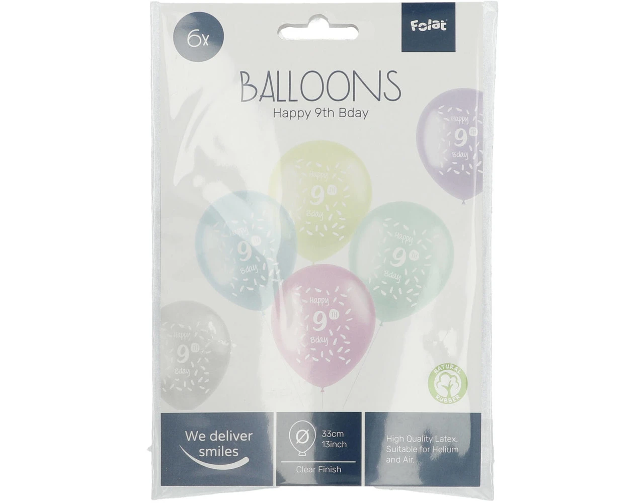 Ballonnen Pastel 9 Jaar Meerkleurig 33cm – 6 stuks. Inhoud: 6 latex ballonnen. Kleur: Meerkleurig. Bijvoorbeeld te gebruiken tijdens de volgende feestgelegenheid/feestgelegenheden: Kinderfeestje en Verjaardag. Elke ballon is 13 inch/33 cm. Het artikel is gemaakt van latex.