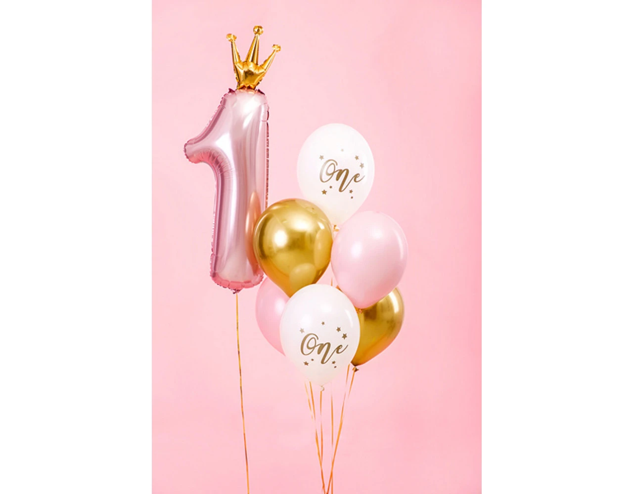 Strong Balloons One, set bevat 6 ballonnen (2 in pastel Pure White kleur met goudopdruk, 2 in pastel Pale Pink kleur en 2 in Glossy goudkleur), diameter ca. 30 cm.