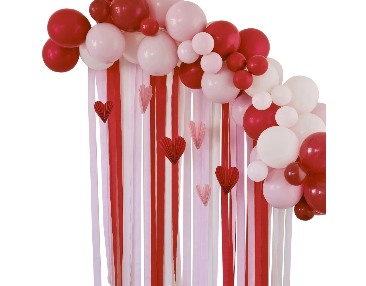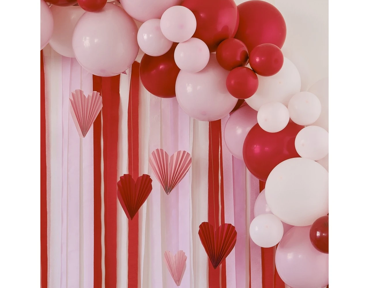 Maak de perfecte romantische feestachtergrond met deze rood-roze ballonboogset! Bestaande uit 55 ballonnen in verschillende maten, plus slingers en papieren hartdecoraties, is het de perfecte manier om je geliefde te verrassen!