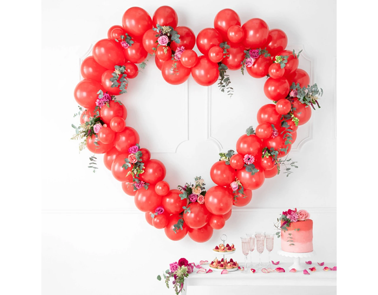 Rode ballonnenslinger met frame Hart, set bevat 68 ballonnen in Pastel Poppy Red kleur, 16 kartonnen elementen, 20 stuks dubbelzijdige lijmstickers, instructie. Afmeting na vouwen ca. 166 x 160 cm.