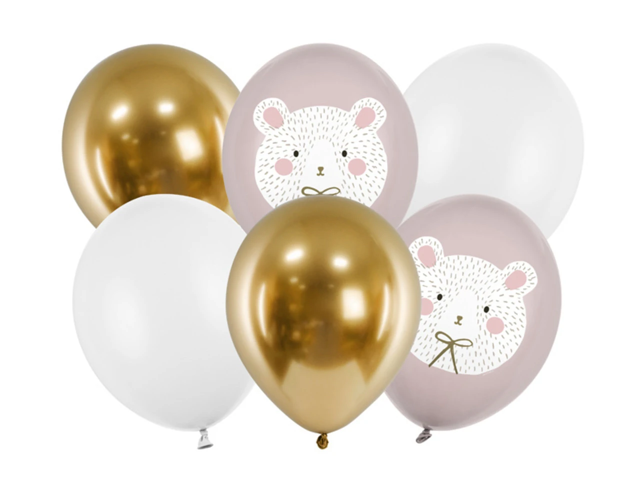 Sterke ballonnen Polar Bear met print, set bevat 6 ballonnen (2 in pastel Warm Grey kleur met kleurrijke print, 2 in pastel Pure White kleur en 2 in Glossy gold kleur), diameter ca. 30 cm.