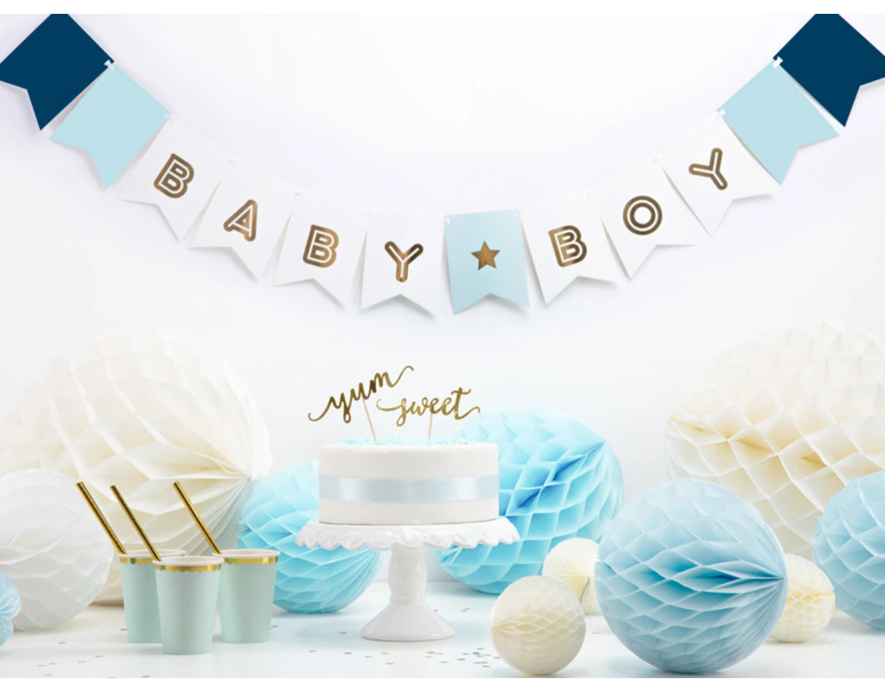 Banier Baby Boy, kleurenmix met goudkleurig opschrift, doe het zelf, set bevat letters en ca. 2,5 m wit lint, maten na montage: hoogte ca. 15 cm, lengte ca. 160 cm.