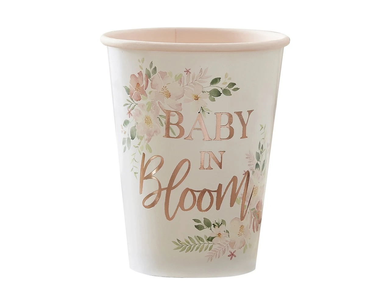 Vier het op je babyshower met onze stijlvolle Rose Gold Foiled ‘Baby in Bloom’ Floral Paper Cups. Deze elegante kopjes vormen de perfecte setting voor de gloeiende ‘Mummy to be’.
