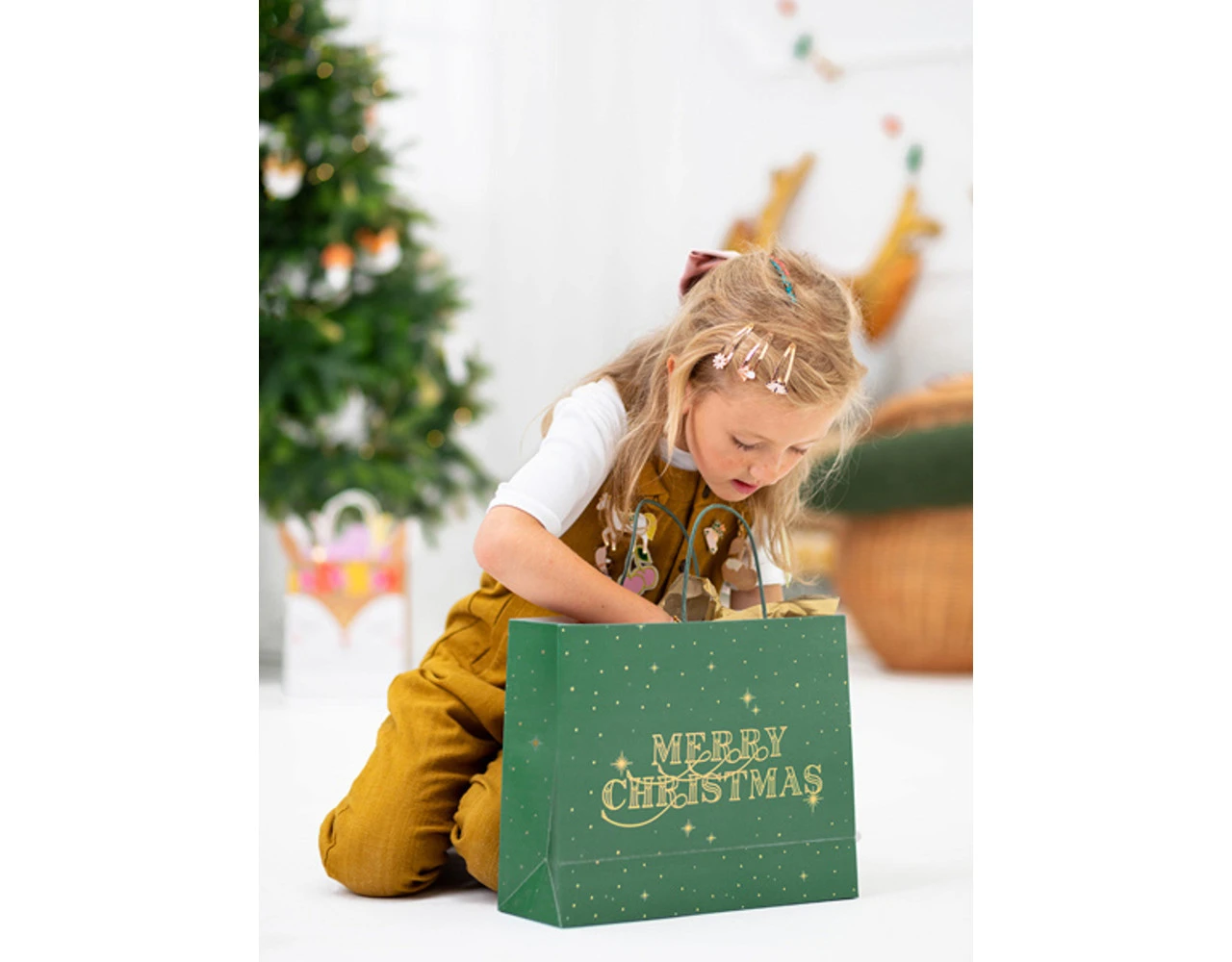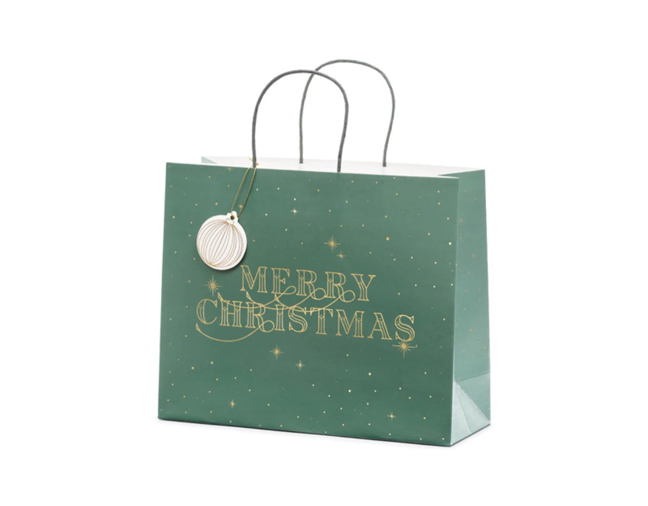 Geschenktas Merry Christmas in flessengroene kleur met goudmetallic opdruk, afmeting zonder hengsels ca. 32,5 x 26,5 x 11,5 cm.