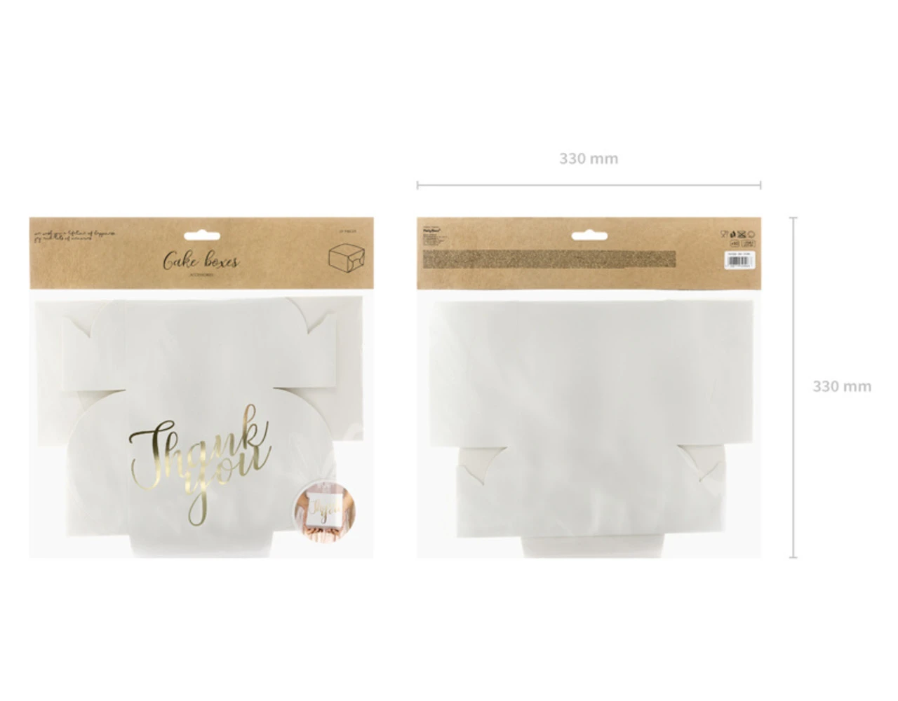 Decoratieve taartdozen van wit papier met goudmetallic opschrift Thank you. Afmeting na assemblage ca. 14 x 8,5 x 14 cm.