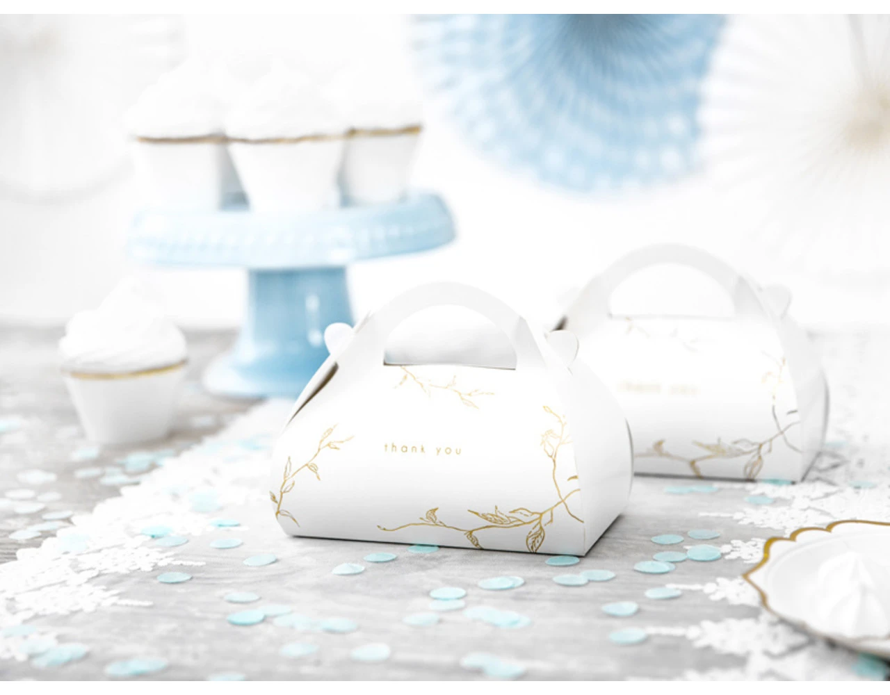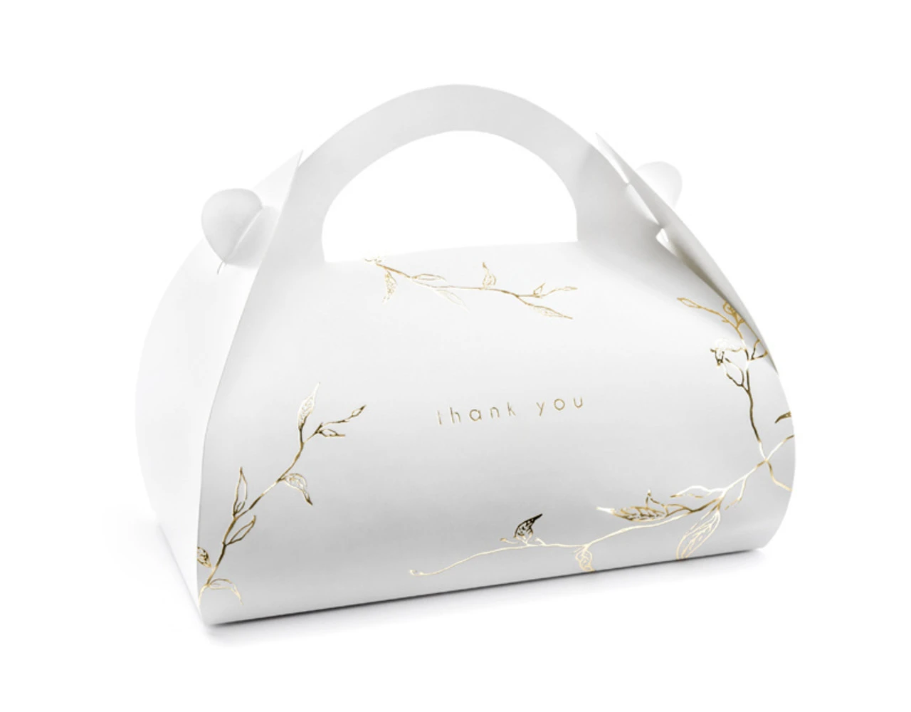 Decoratieve taartdozen van wit papier, met goudkleurig metallic takkenpatroon. Afmeting na assemblage ca. 16 x 8,5 x 9,5 cm.