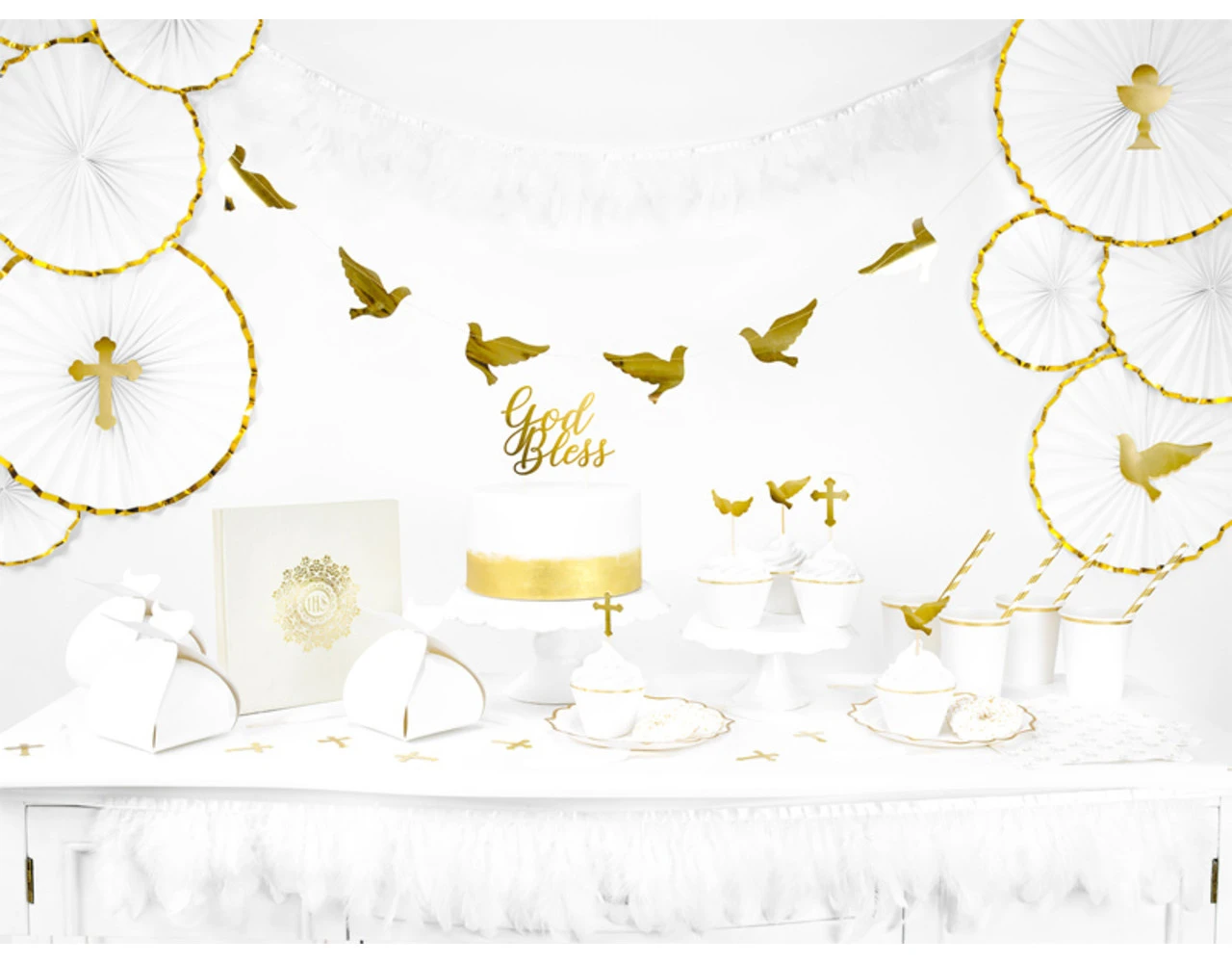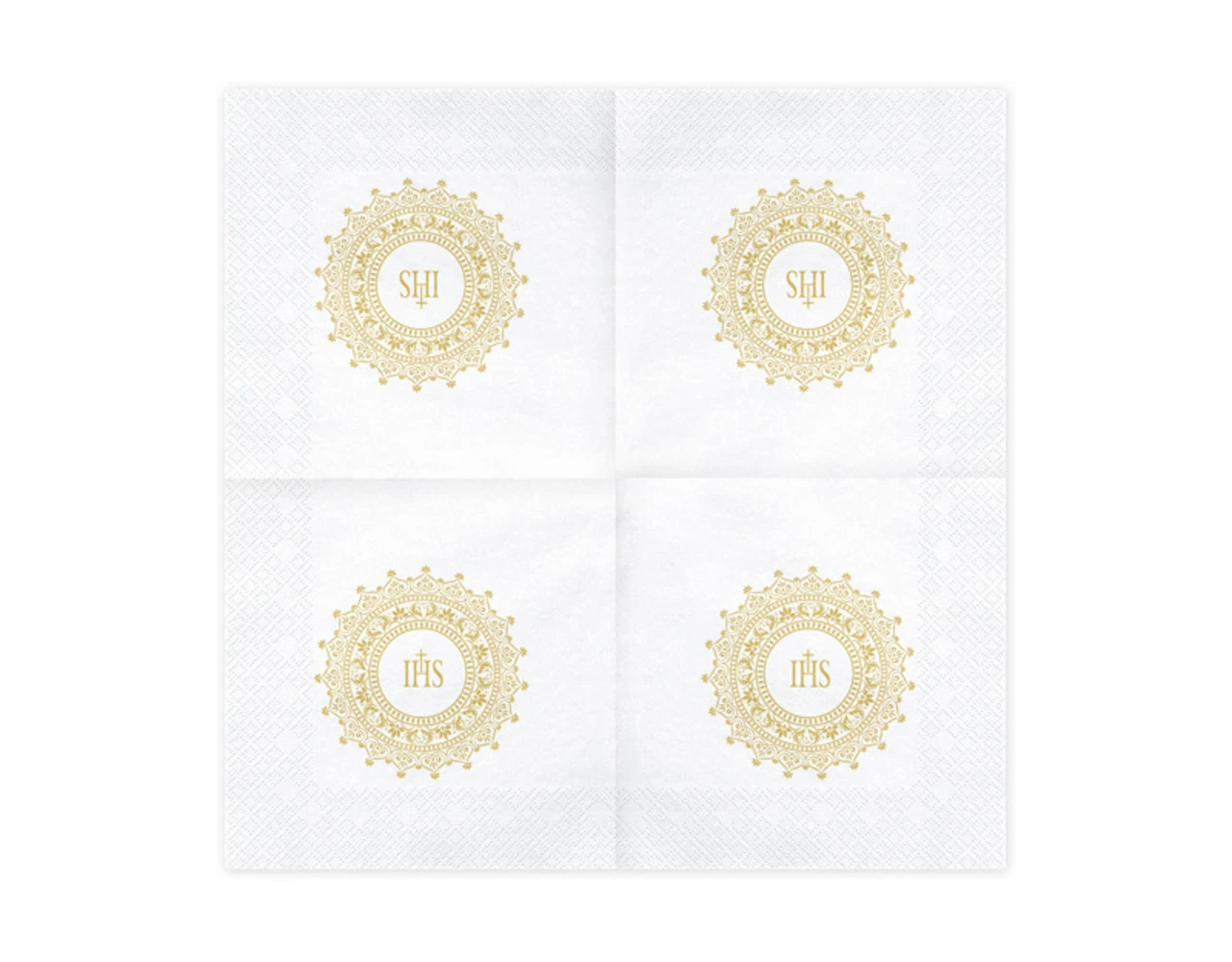 Papieren servetten Eerste Communie, wit met gouden IHS opdruk, formaat na uitvouwen ca. 33 x 33 cm, formaat na assembleren ca. 16,5 x 16,5 cm.
