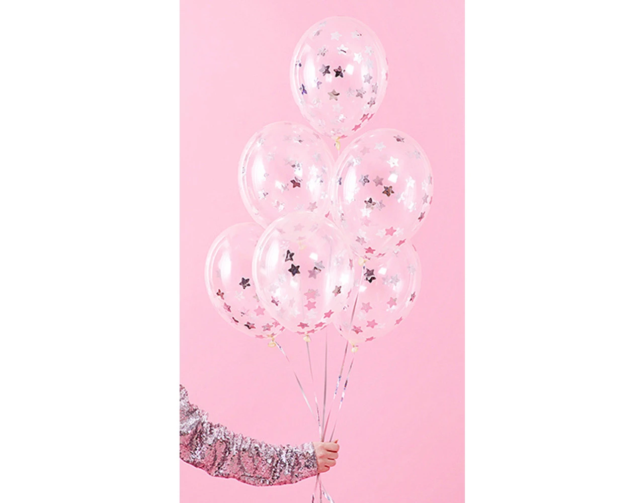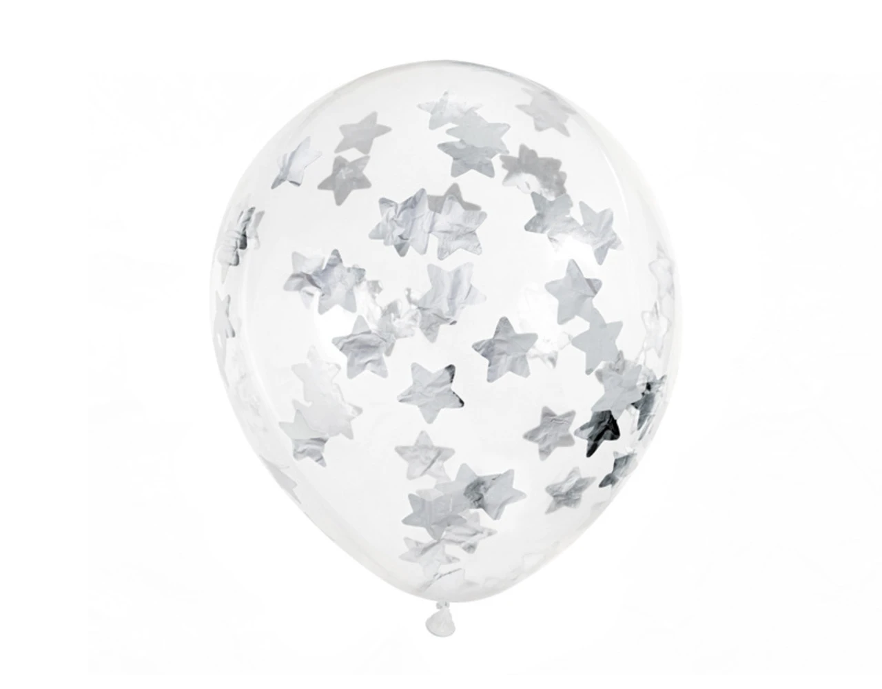 Heldere ballonnen met zilver metallic confetti in de vorm van sterren binnenin, diameter ballon ca. 30 cm.