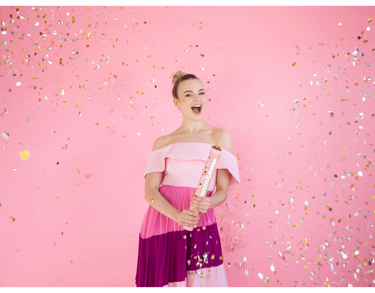 Inhoud: Confettikanon schieten uit metalen cirkels, dubbelzijdig – zilver enerzijds en goud anderzijds, lengte 60 cm.