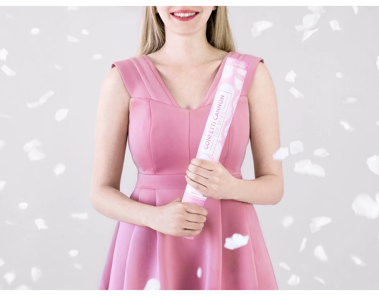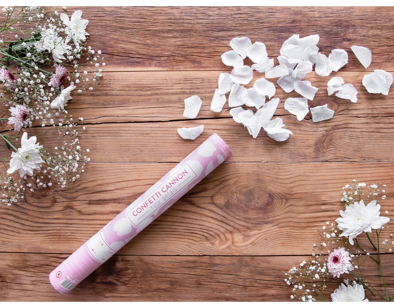 Inhoud: Confetti kanon schieten uit witte kunstmatige rozenblaadjes, lengte 60 centimiters.