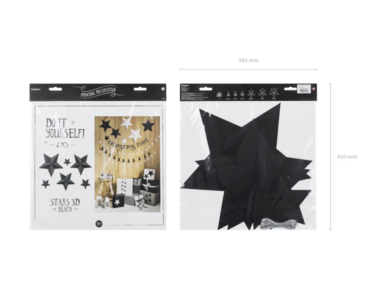 Decoratie Sterren, zwart, doe het zelf, set bevat sterren in de maten ca.: 37 x 35 cm, 33 x 31 cm, 28,5 x 27,5 cm, 16 x 15 cm, 14 x 13,5 cm, 12 x 11,5 cm en zilverkleurig bindtouw.
