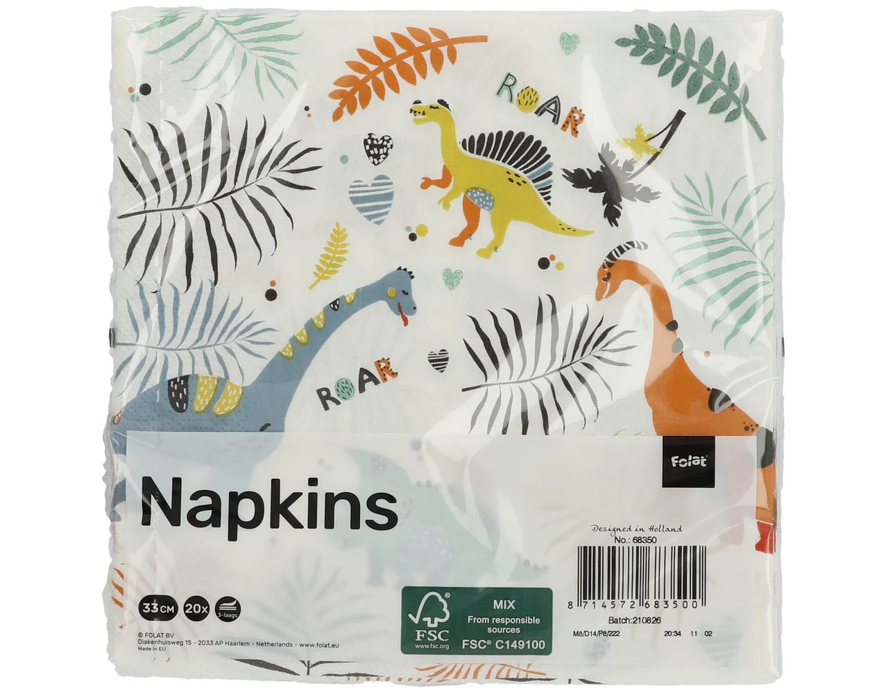 Servetten Dino Roars 33x33cm – 20 stuks. Inhoud: 20 servetten. Kleur: Meerkleurig. Bijvoorbeeld te gebruiken tijdens de volgende feestgelegenheid/feestgelegenheden: Kinderfeestje. Een servet is 33x33cm groot. Het artikel is gemaakt van papier.