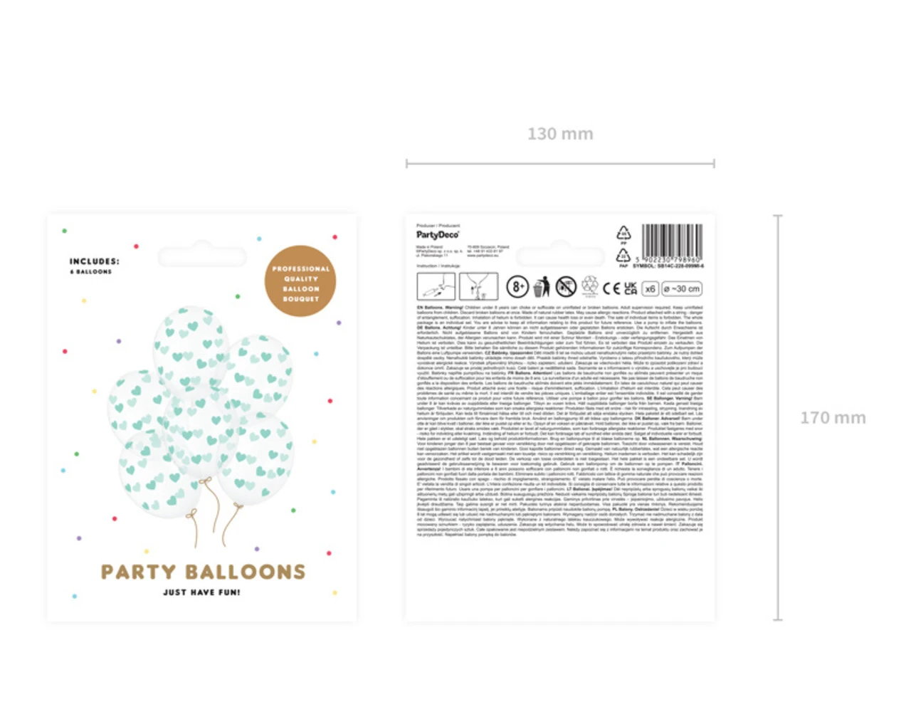 Sterke Ballonnen Harten, Kristalhelder met mint, vijfzijdige opdruk, diameter 30 centimeter.