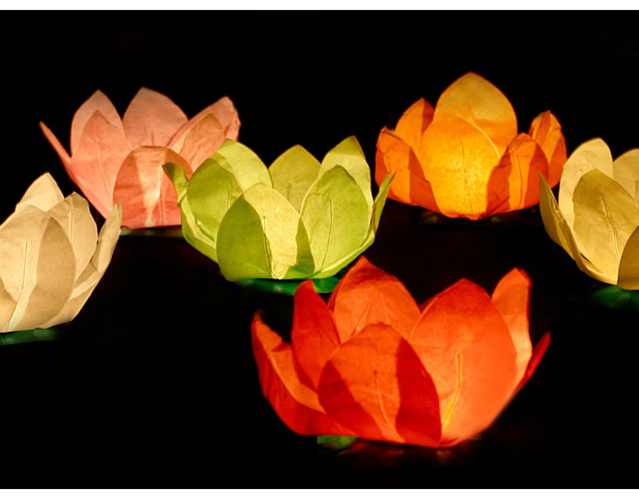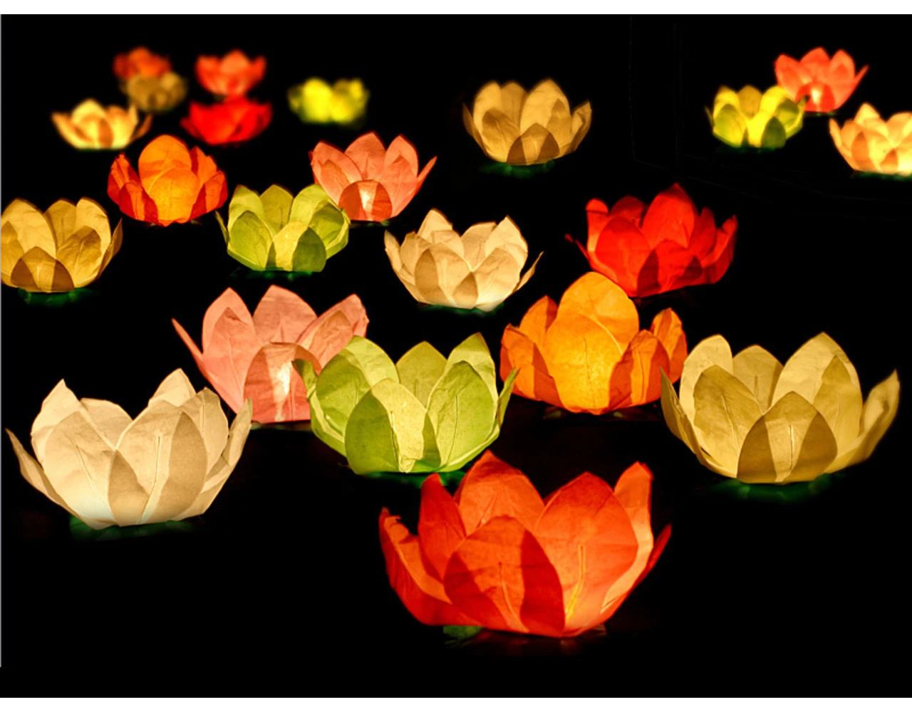 Drijvende lantaarn, mix van kleuren (wit, rood, mint, oranje, groen, blauw), diameter 29 centimeter. Elke lantaarn heeft een kaarsverwarmer.