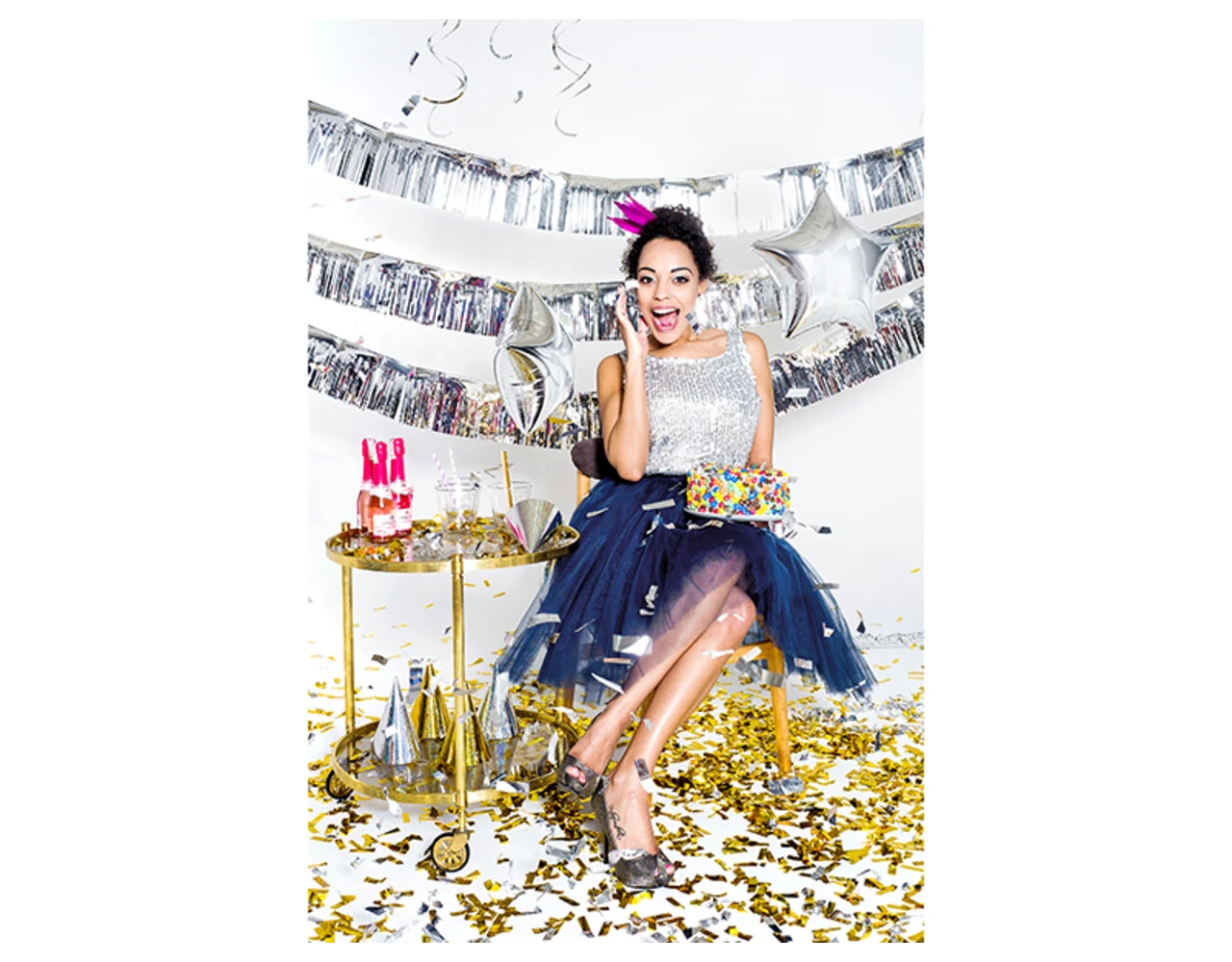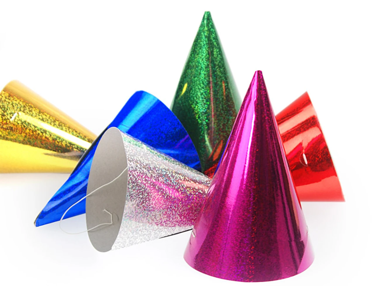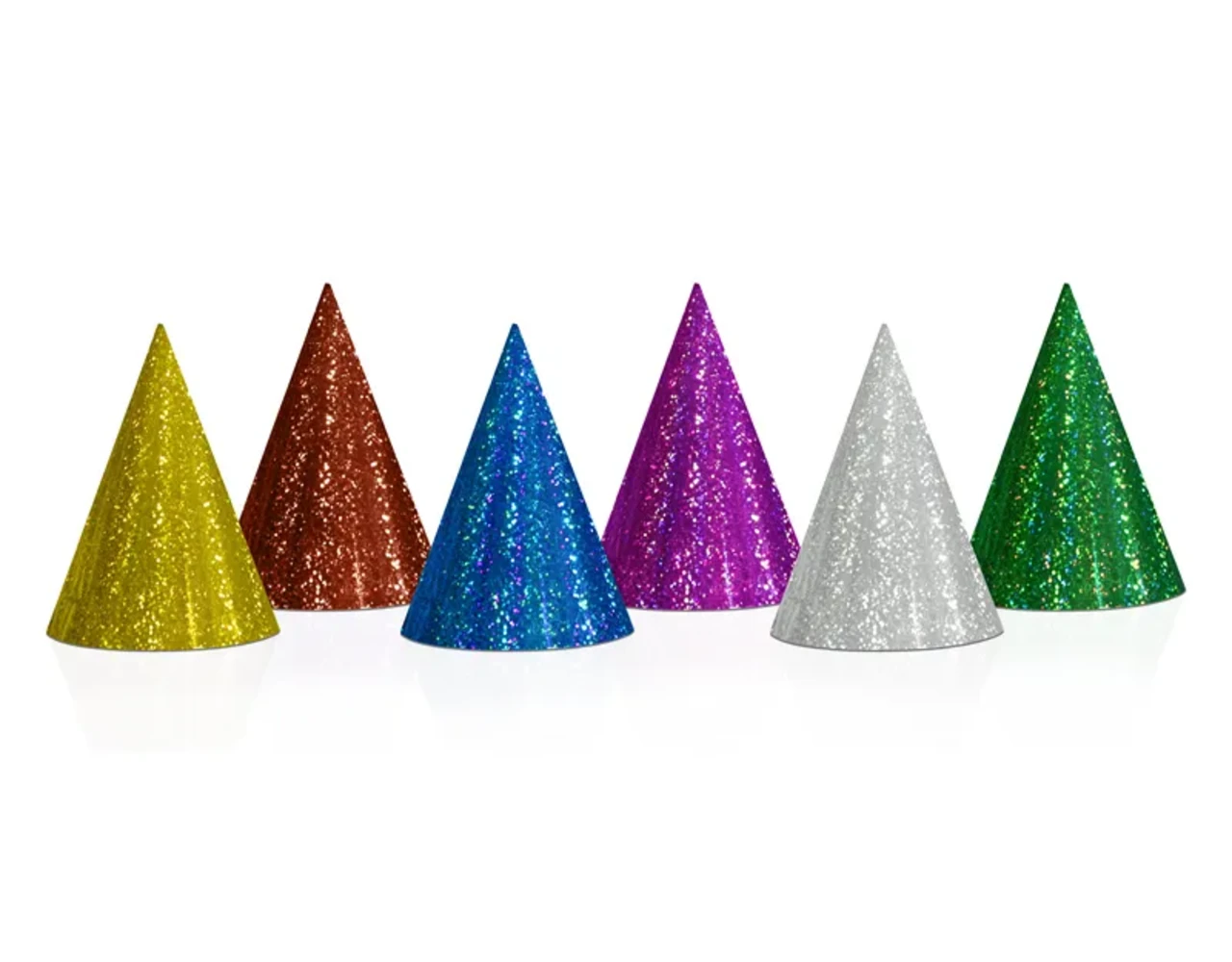 Holografische feesthoedjes, mix van kleuren, hoogte ongeveer 16 centimeter, diameter ongeveer 10 centimeter.