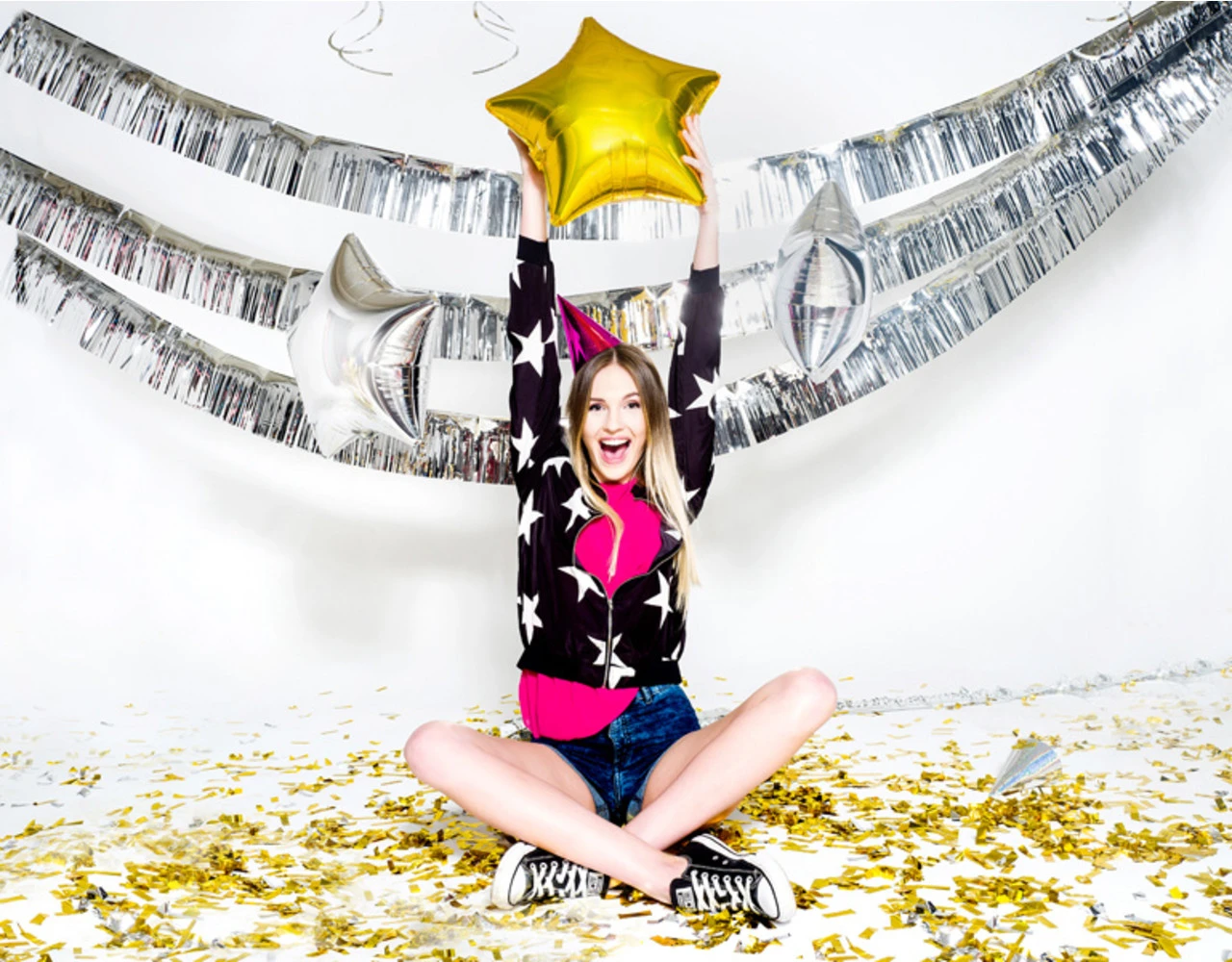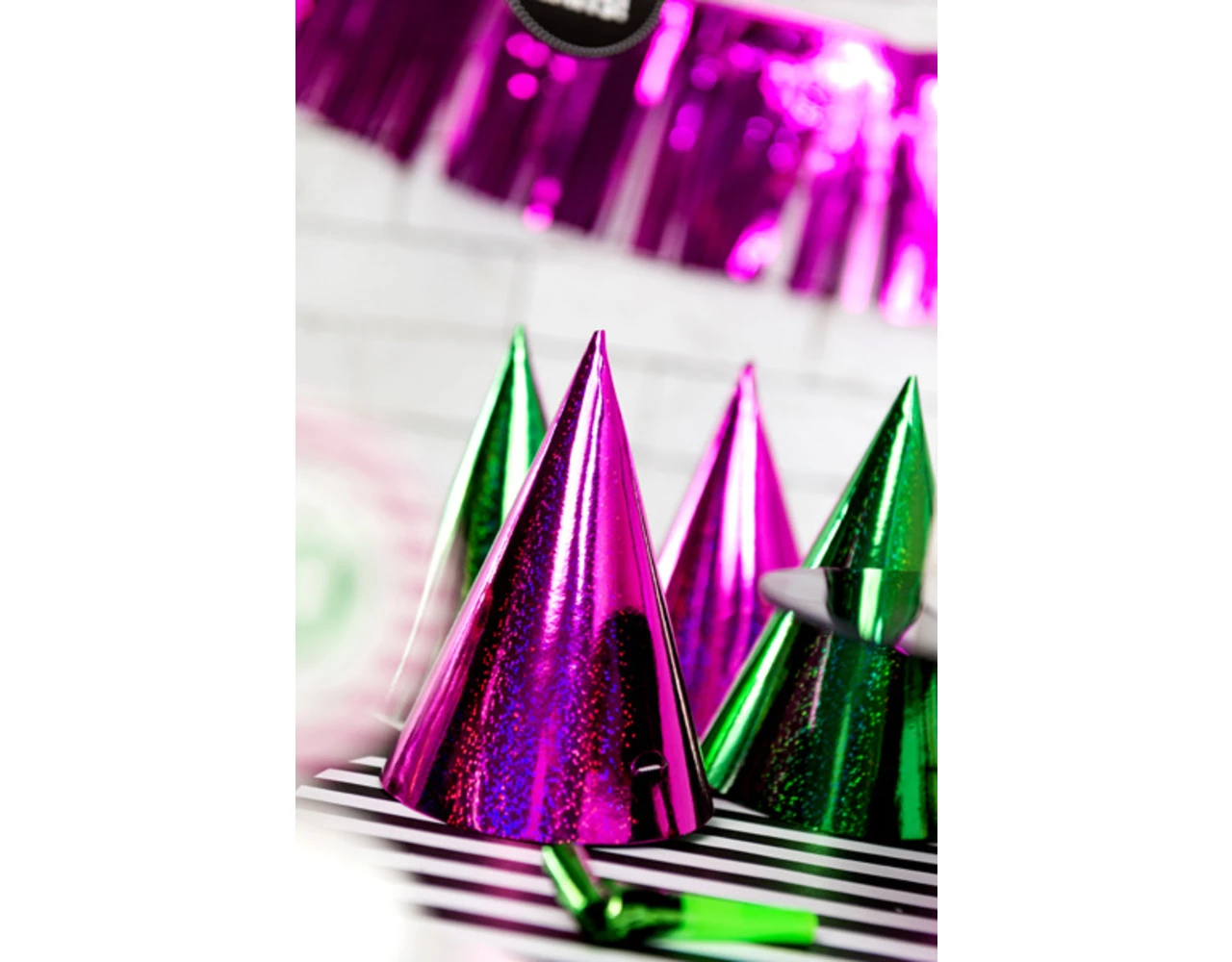 Holografische feesthoedjes, mix van kleuren, hoogte ongeveer 16 centimeter, diameter ongeveer 10 centimeter.