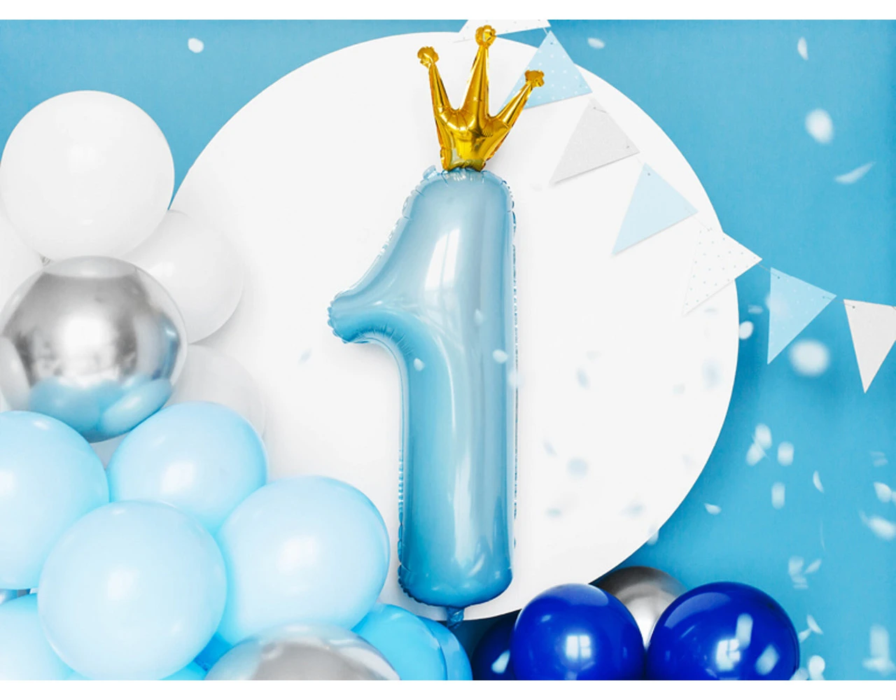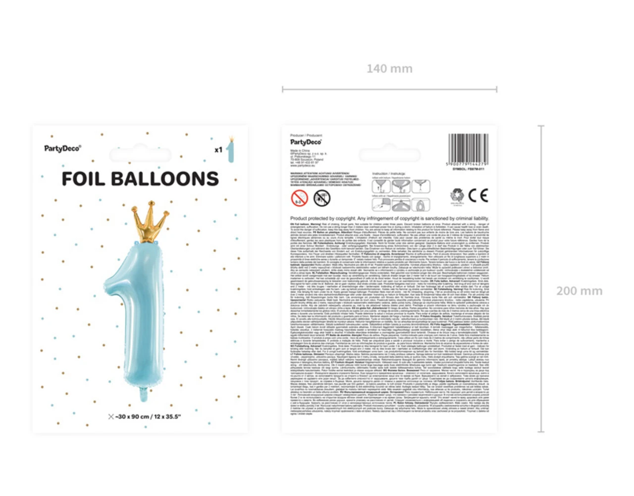 Metallic folieballon Nummer 1 in hemelsblauwe kleur met kroon in goudkleur, afmeting voor opblazen ca. 37 x 100 cm, afmeting na opblazen ca. 30 x 92 cm. Opblazen met lucht en helium