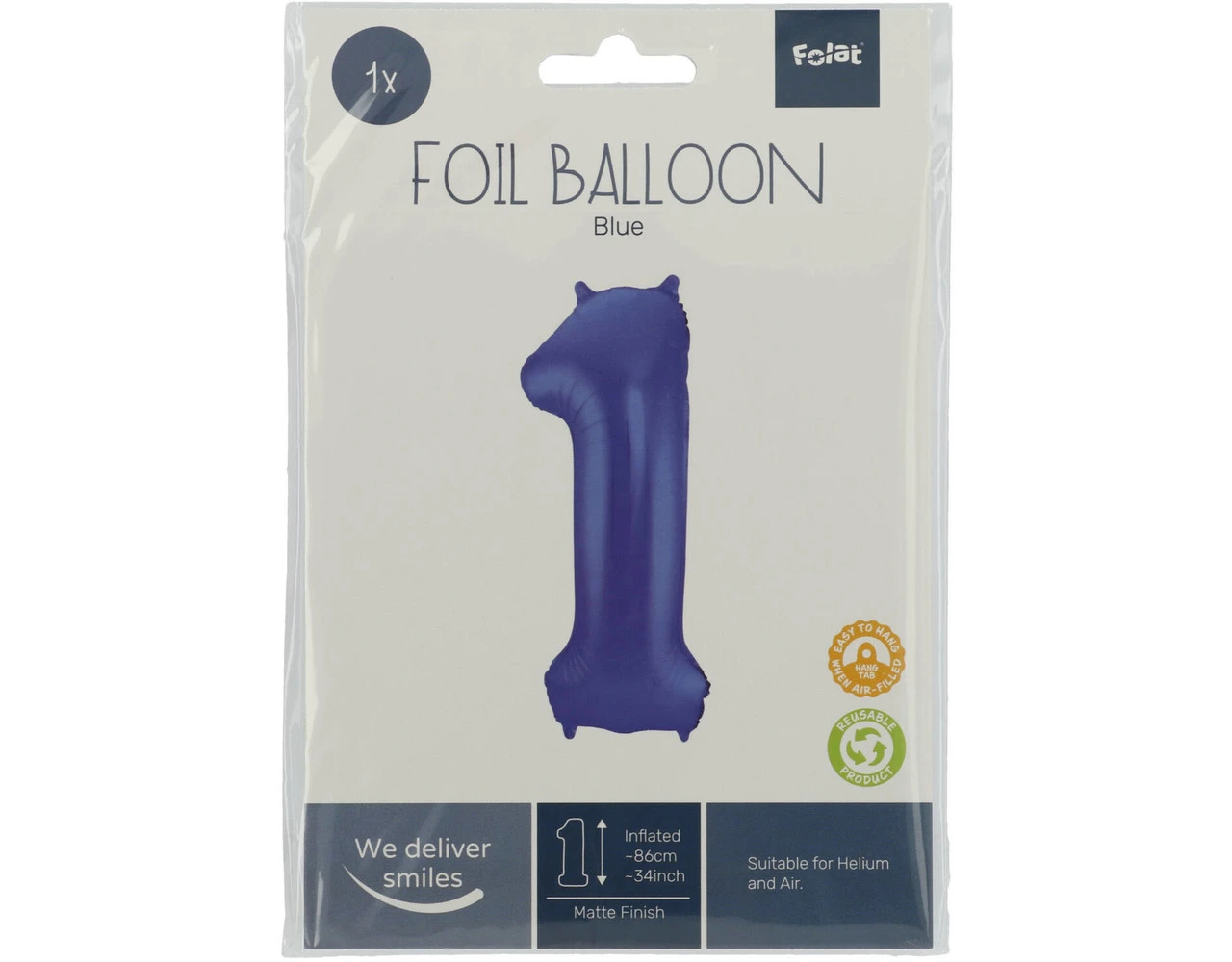 Mooie grote folieballon van het cijfer 1 in een metallic mat blauwe kleur. Inhoud: 1 folieballon van 86cm. Kleur: Blauw. De ballon komt met handige ophang tabs, zodat hij makkelijk opgehangen kan worden. Bijvoorbeeld te gebruiken tijdens de volgende feestgelegenheid/feestgelegenheden: Verjaardag, Kinderfeestje en Jubileum. Deze folieballon is 34 inch/86 cm. Het artikel is gemaakt van folie.