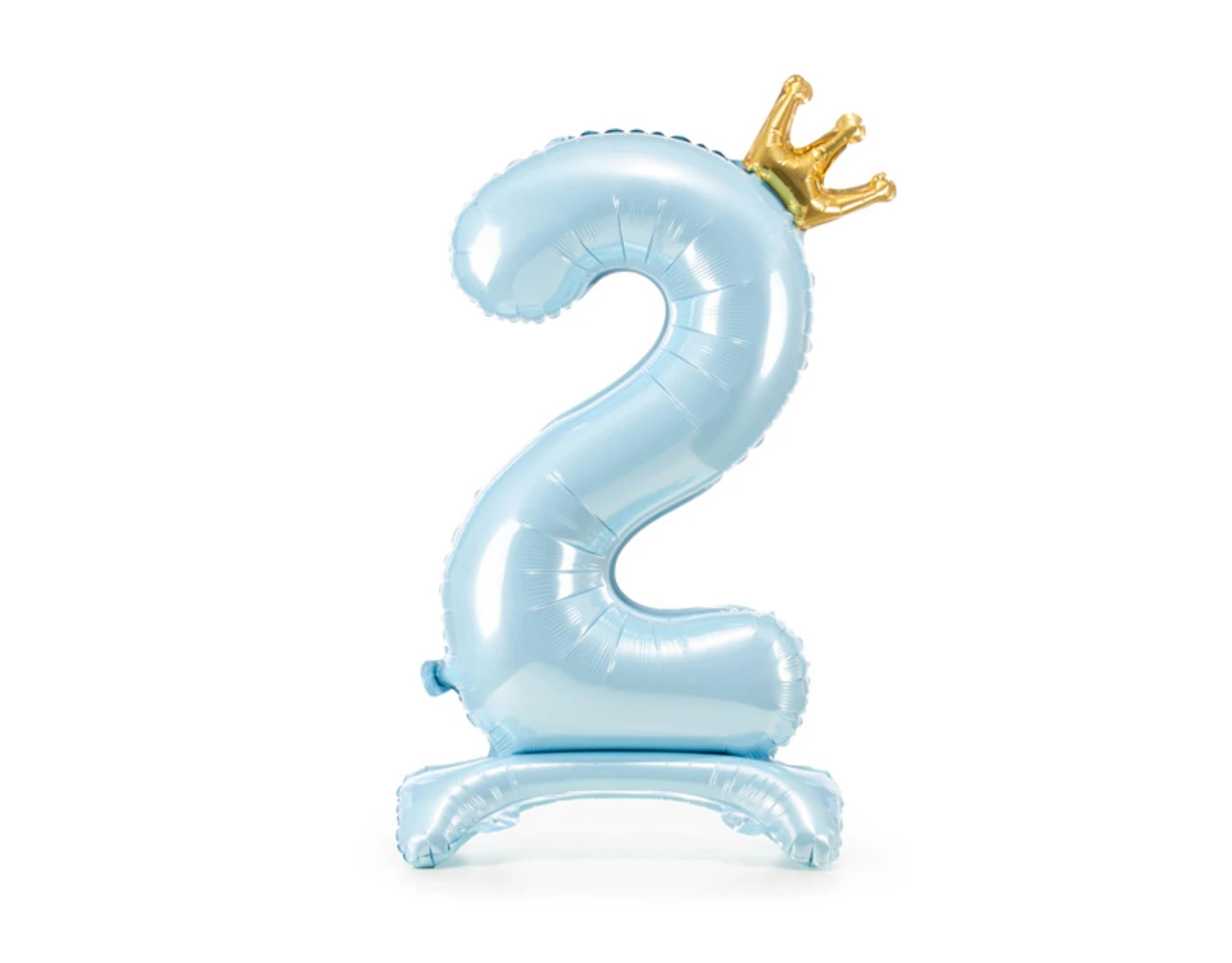 Staande, metallic folieballon Nummer ”2” in hemelsblauwe kleur met een kroon in goudkleur, afmeting voor opblazen ca. 103 cm (40,5”), afmeting na opblazen 84 cm (33”). Opblazen met lucht.