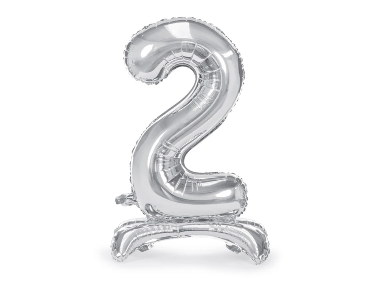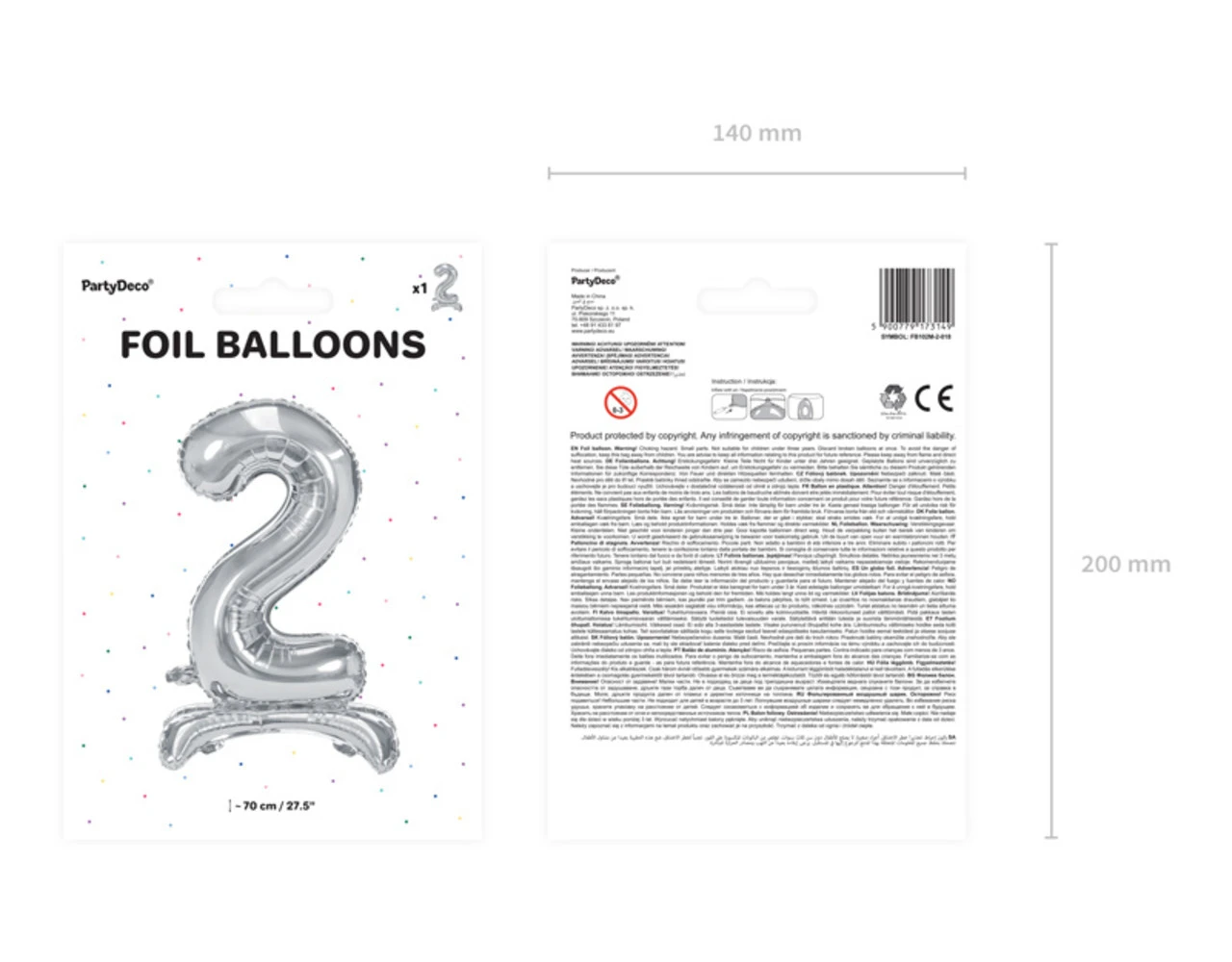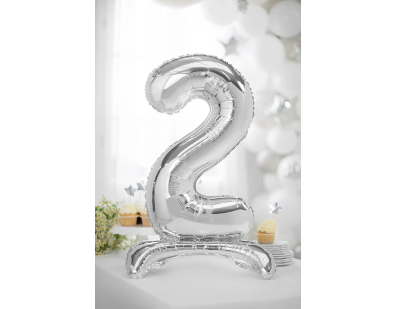 Metallic staande folieballon Nummer ”2” in zilverkleur, afmeting voor opblazen ca. 90 cm (35”), afmeting na opblazen ca. 70 cm (27,5”). Opblazen met lucht.