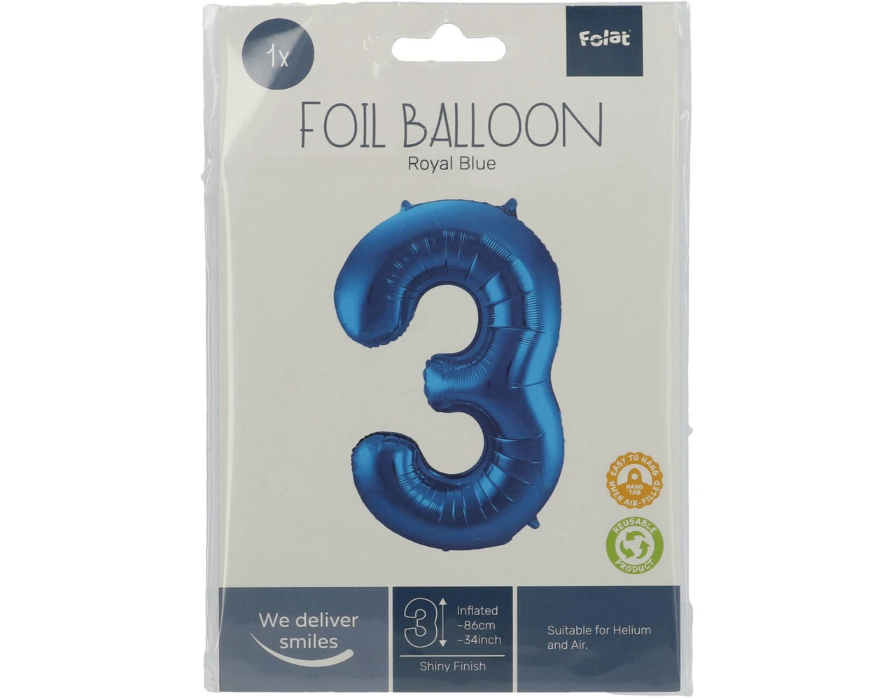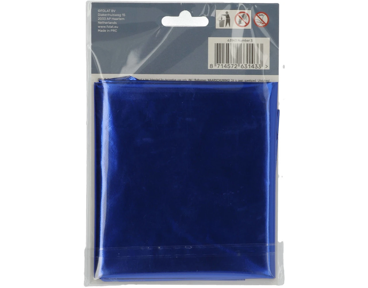 Blauwe Folieballon Cijfer 3 – 86cm. Inhoud: 1 folieballon. Kleur: Blauw. Bijvoorbeeld te gebruiken tijdens de volgende feestgelegenheid/feestgelegenheden: Verjaardag, Jubileum en Kinderfeestje. Deze folieballon is 34 inch/86 cm. Het artikel is gemaakt van folie.