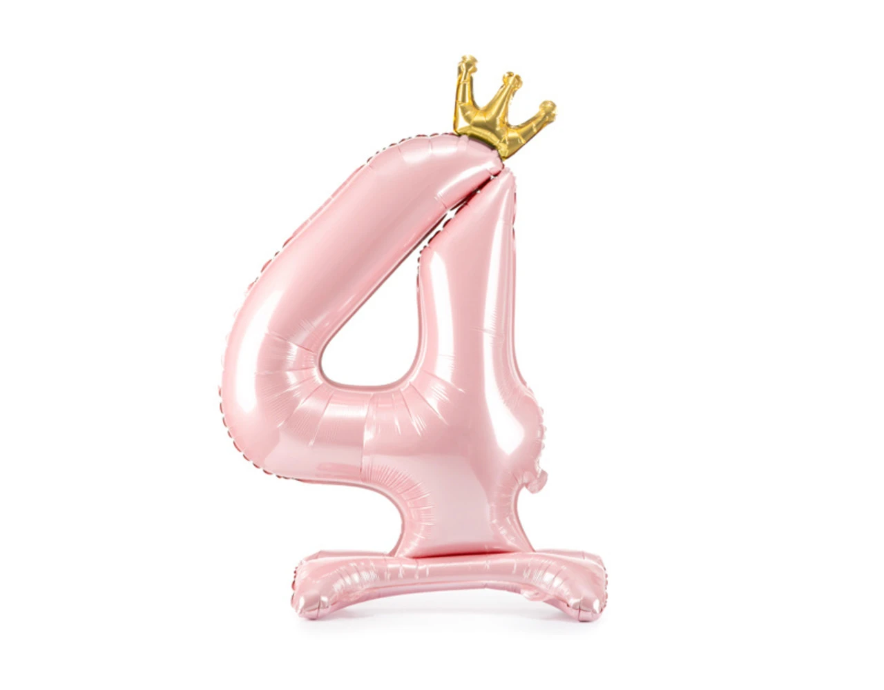 Staande, metallic folieballon Nummer ”4” in lichtroze kleur met een kroon in goudkleur, afmeting voor opblazen ca. 103 cm (40,5”), afmeting na opblazen 84 cm (33”). Opblazen met lucht.