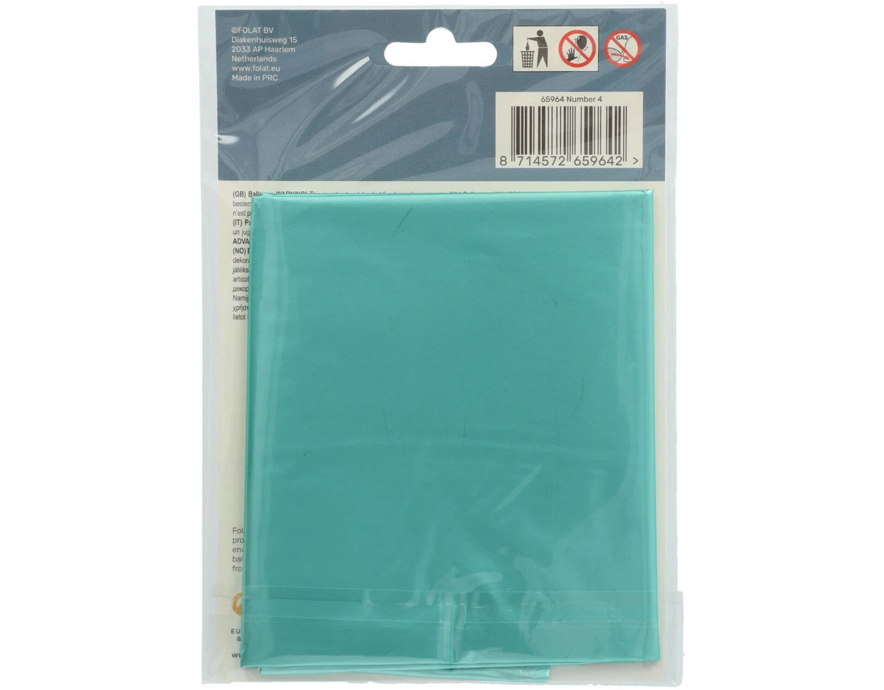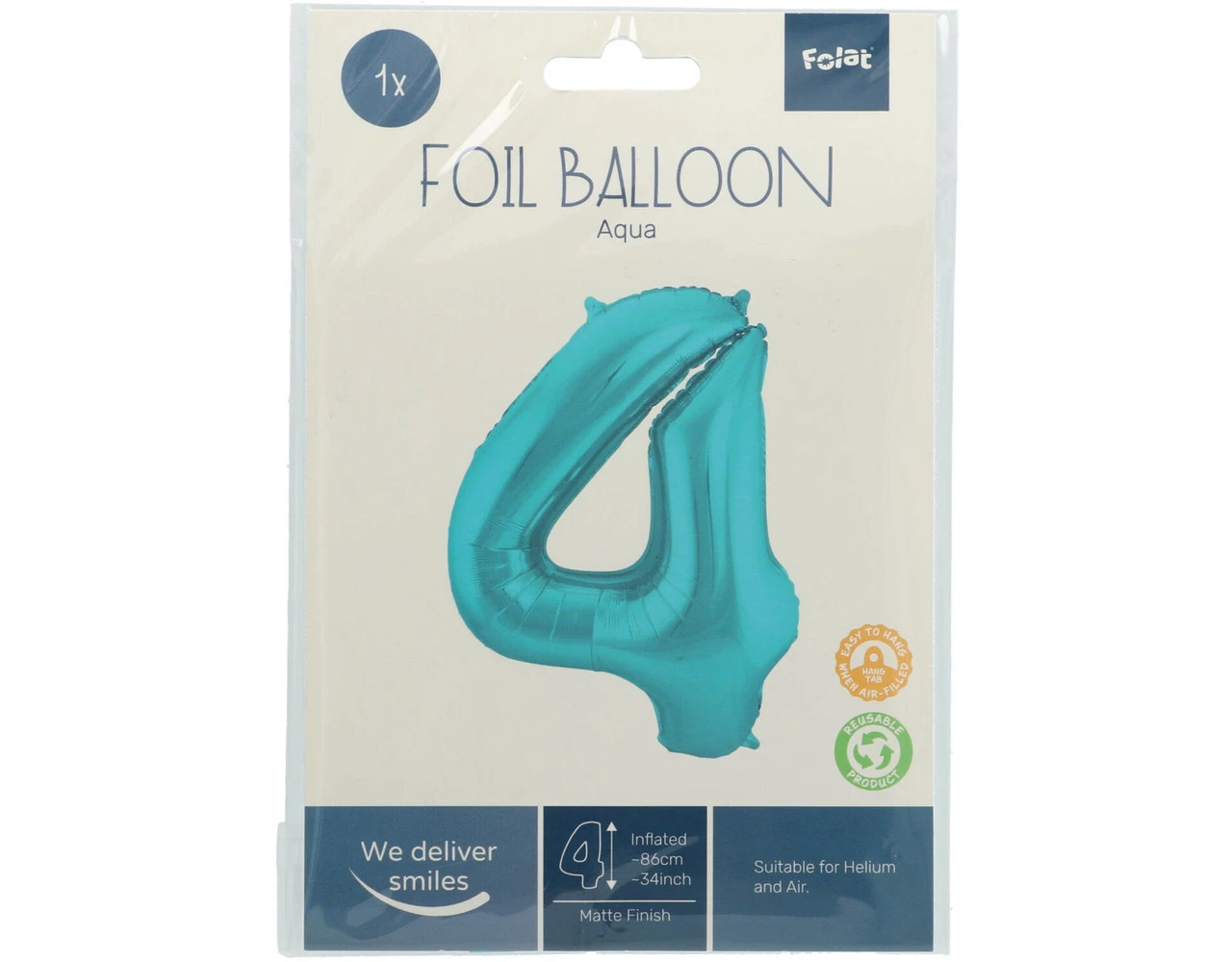 Folieballon Cijfer 4 Pastel Aqua Metallic Mat – 86 cm. Inhoud: 1 folieballon. Kleur: Blauw. Bijvoorbeeld te gebruiken tijdens de volgende feestgelegenheid/feestgelegenheden: Verjaardag, Kinderfeestje en Jubileum. Deze folieballon is 34 inch/86 cm. Het artikel is gemaakt van folie.