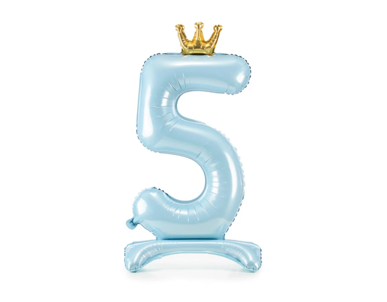 Staande, metallic folieballon Nummer ”5” in hemelsblauwe kleur met een kroon in goudkleur, afmeting voor opblazen ca. 103 cm (40,5”), afmeting na opblazen 84 cm (33”). Opblazen met lucht.