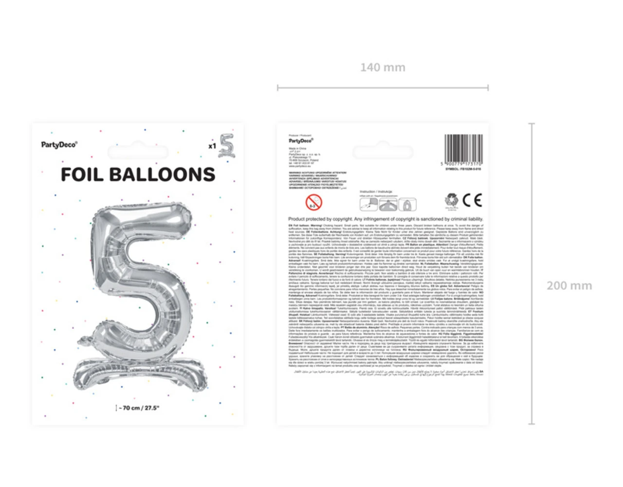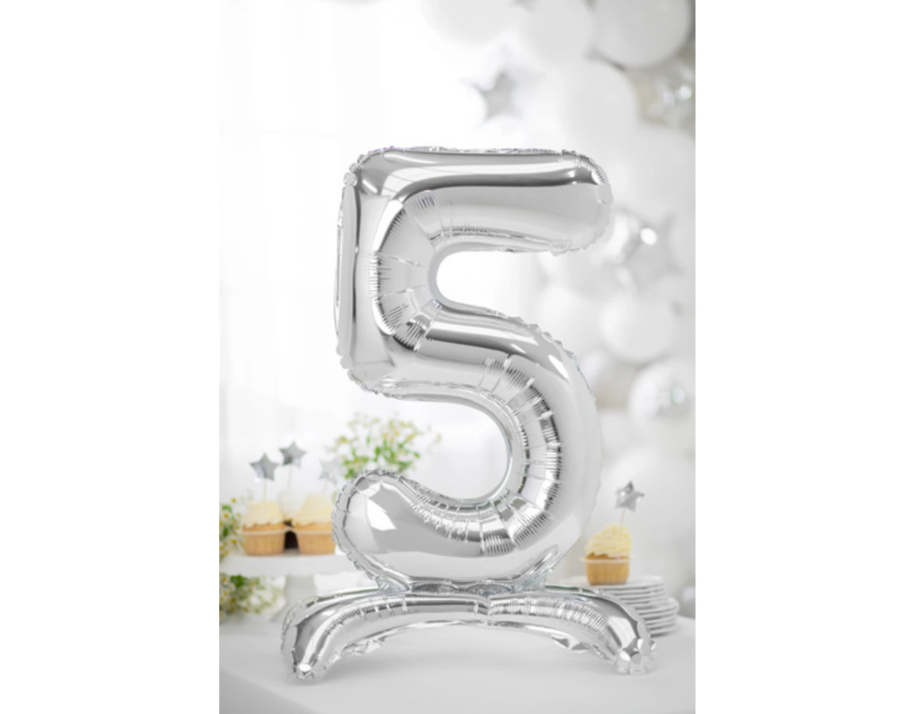 Metallic staande folieballon Nummer ”5” in zilverkleur, afmeting voor opblazen ca. 90 cm (35”), afmeting na opblazen ca. 70 cm (27,5”). Opblazen met lucht.
