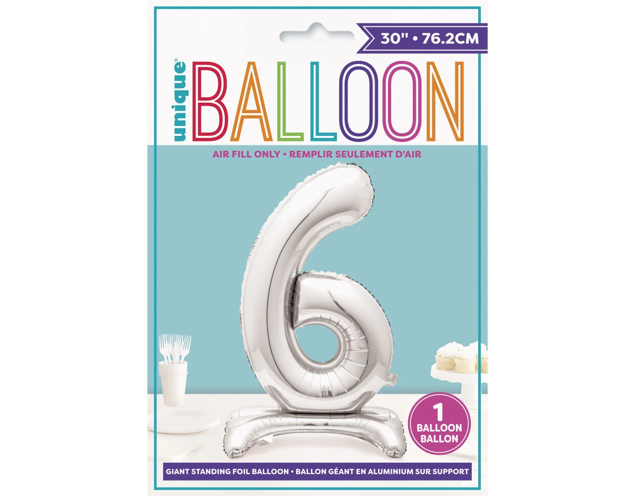 Verpakkingsinhoud: Folie Ballon Cijfer 6 Zilver met standaard 76cm
