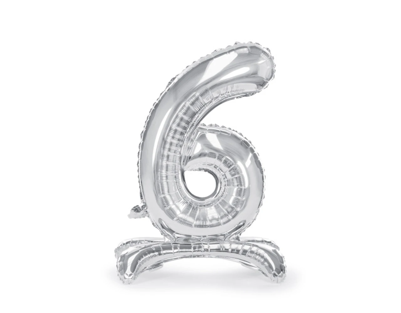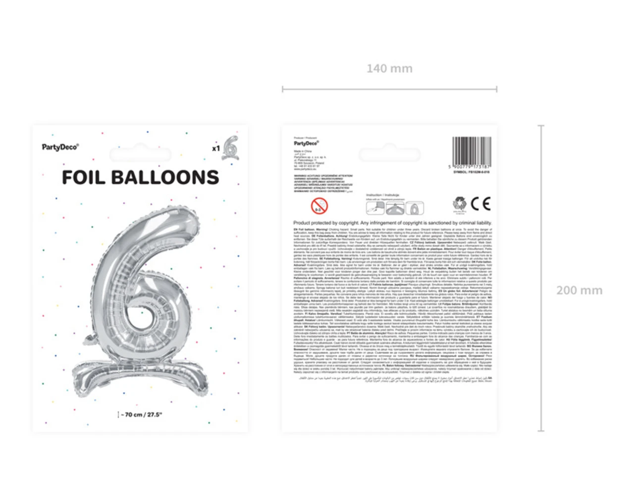 Metallic staande folieballon Nummer ”6” in zilverkleur, afmeting voor opblazen ca. 90 cm (35”), afmeting na opblazen ca. 70 cm (27,5”). Opblazen met lucht.