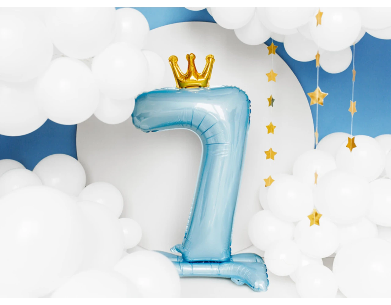 Staande, metallic folieballon Nummer ”7” in hemelsblauwe kleur met een kroon in goudkleur, afmeting voor opblazen ca. 103 cm (40,5”), afmeting na opblazen 84 cm (33”). Opblazen met lucht.