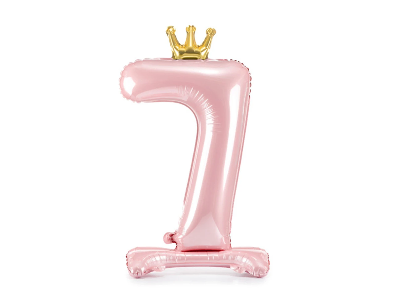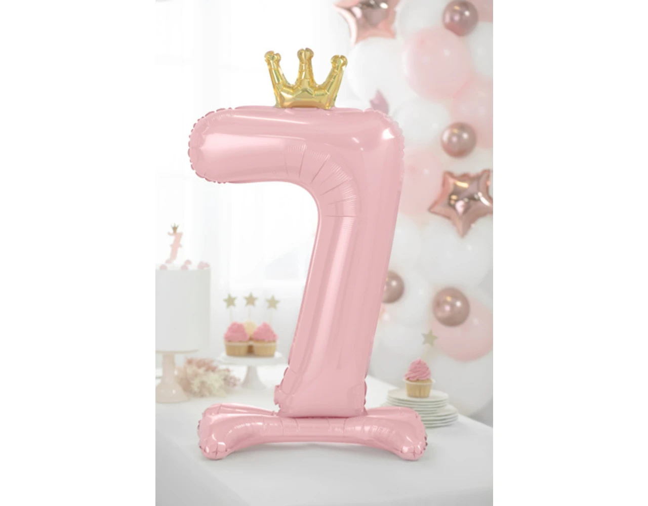 Staande, metallic folieballon Nummer ”7” in lichtroze kleur met een kroon in goudkleur, afmeting voor opblazen ca. 103 cm (40,5”), afmeting na opblazen 84 cm (33”). Opblazen met lucht.