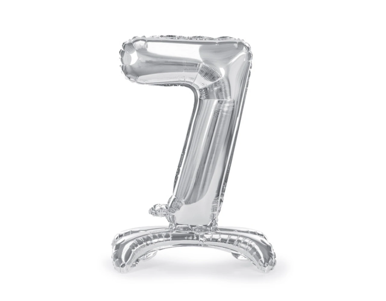 Metallic staande folieballon Nummer ”7” in zilverkleur, afmeting voor opblazen ca. 90 cm (35”), afmeting na opblazen ca. 70 cm (27,5”). Opblazen met lucht.