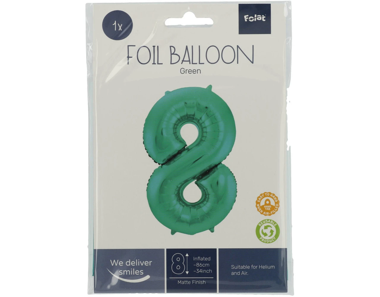 Mooie grote folieballon van het cijfer 8 in een metallic mat groene kleur. Inhoud: 1 folieballon van 86cm. Kleur: Groen. De ballon komt met handige ophang tabs, zodat hij makkelijk opgehangen kan worden. Bijvoorbeeld te gebruiken tijdens de volgende feestgelegenheid/feestgelegenheden: Verjaardag, Kinderfeestje en Jubileum. Deze folieballon is 34 inch/86 cm. Het artikel is gemaakt van folie.