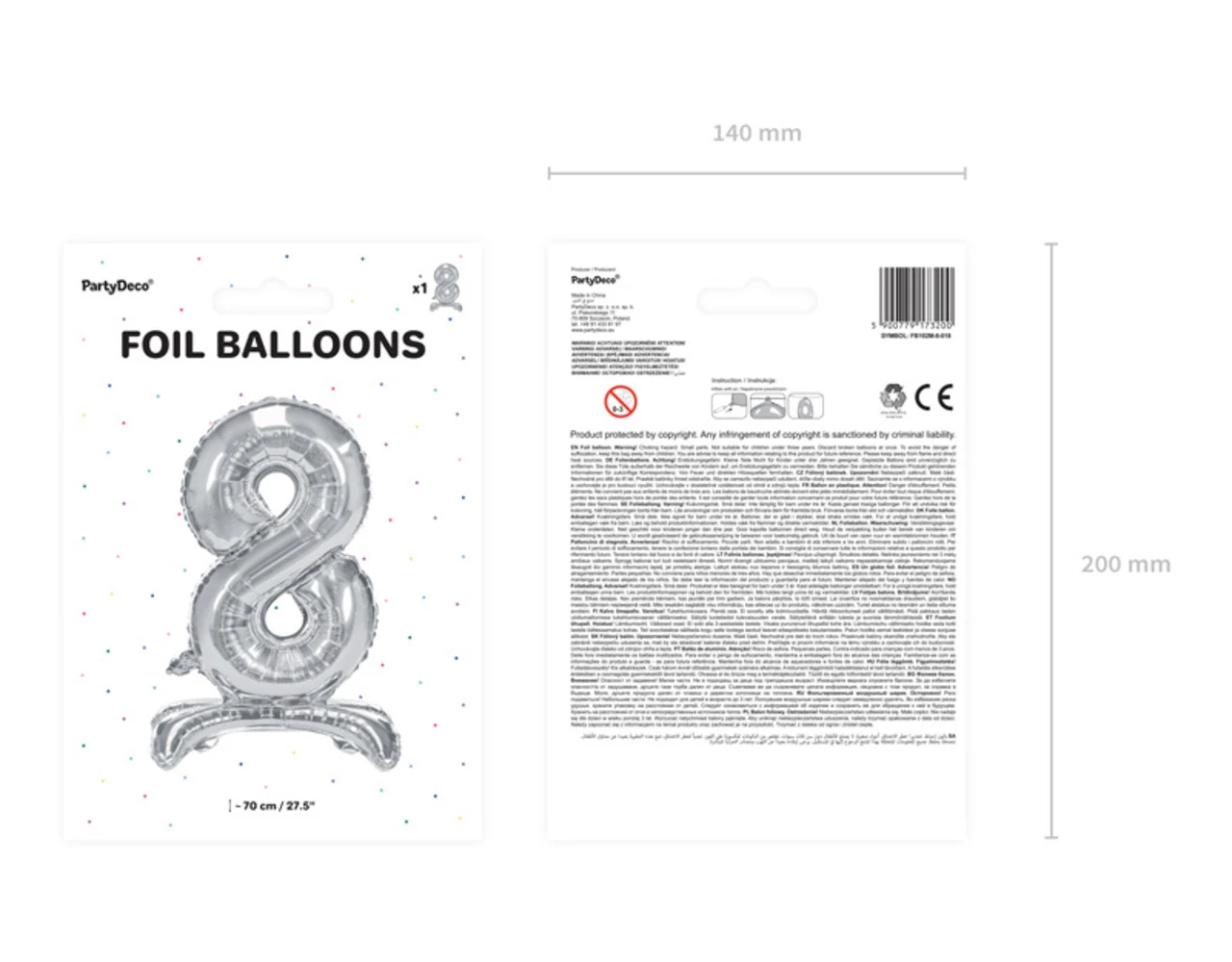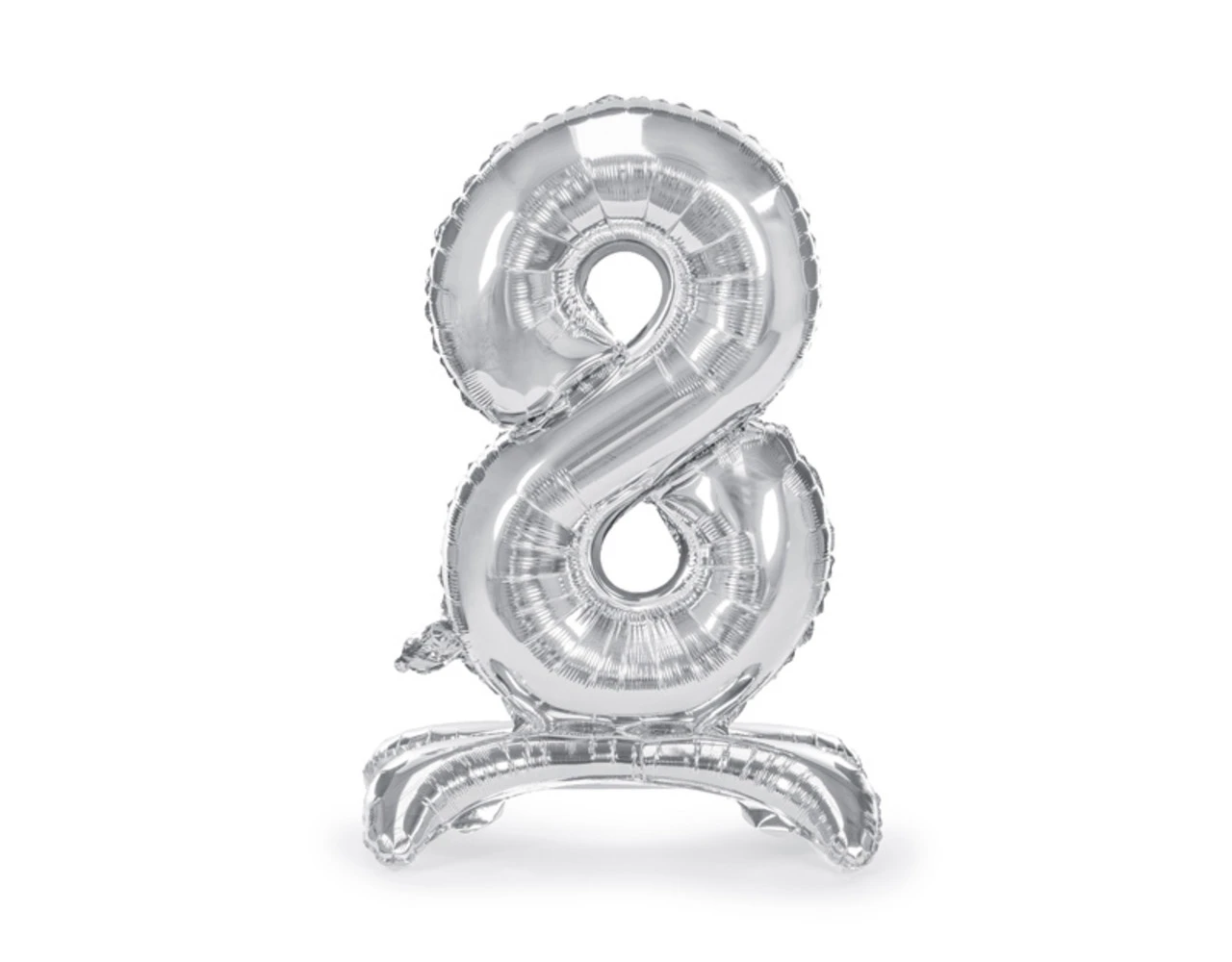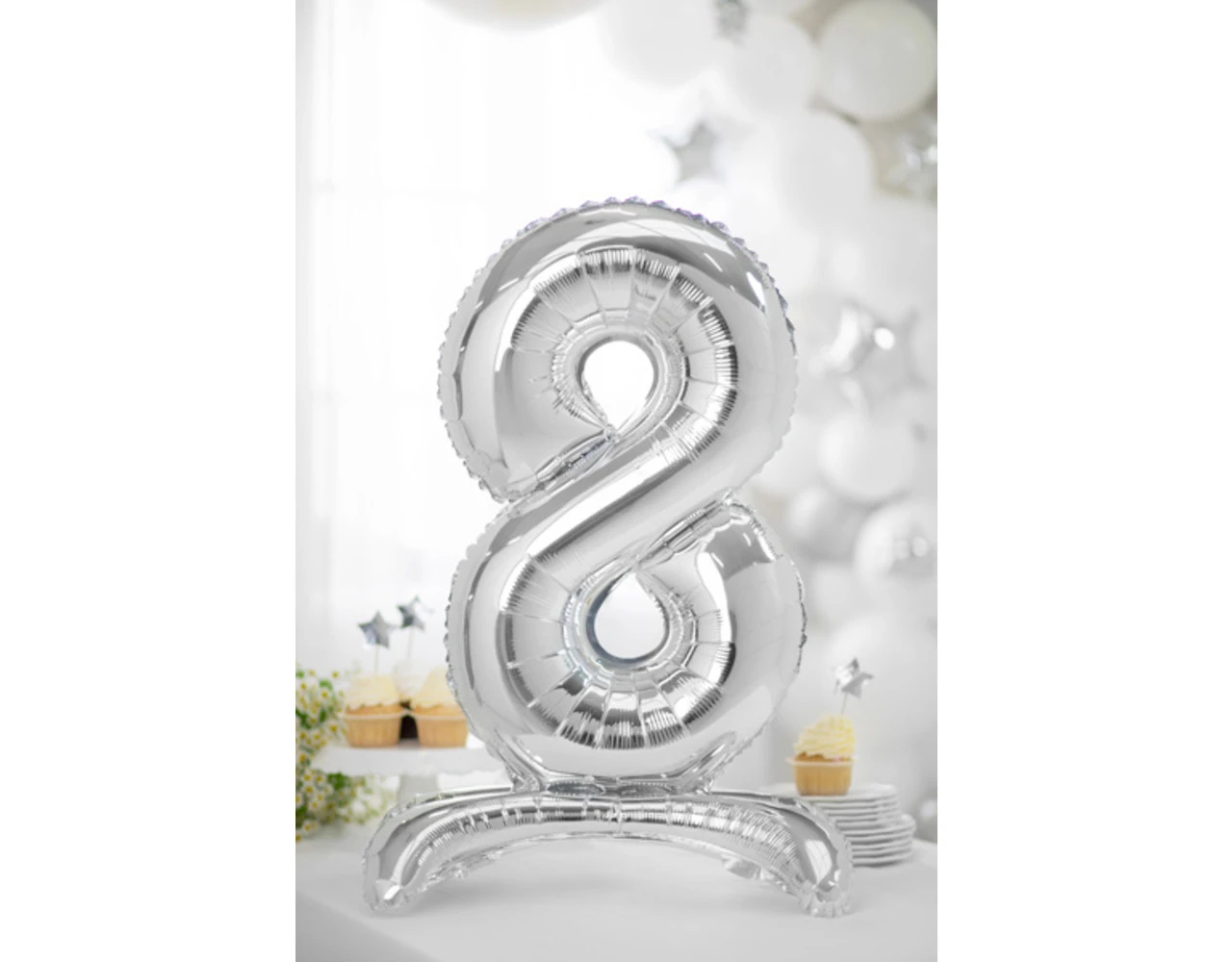 Metallic staande folieballon Nummer ”8” in zilverkleur, afmeting voor opblazen ca. 90 cm (35”), afmeting na opblazen ca. 70 cm (27,5”). Opblazen met lucht.