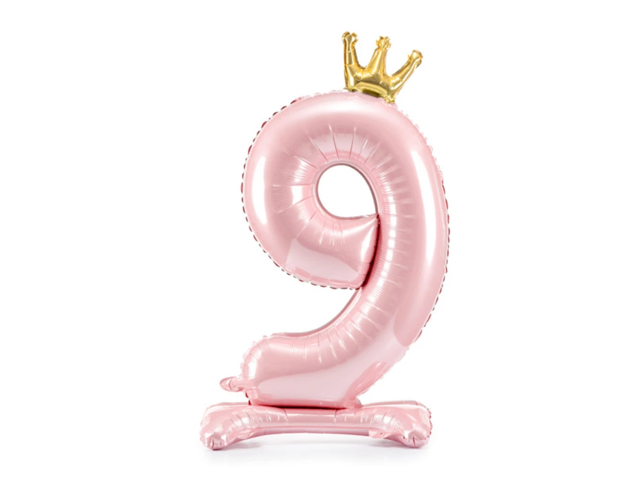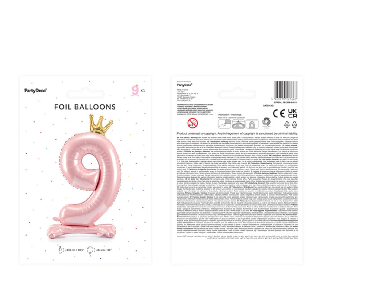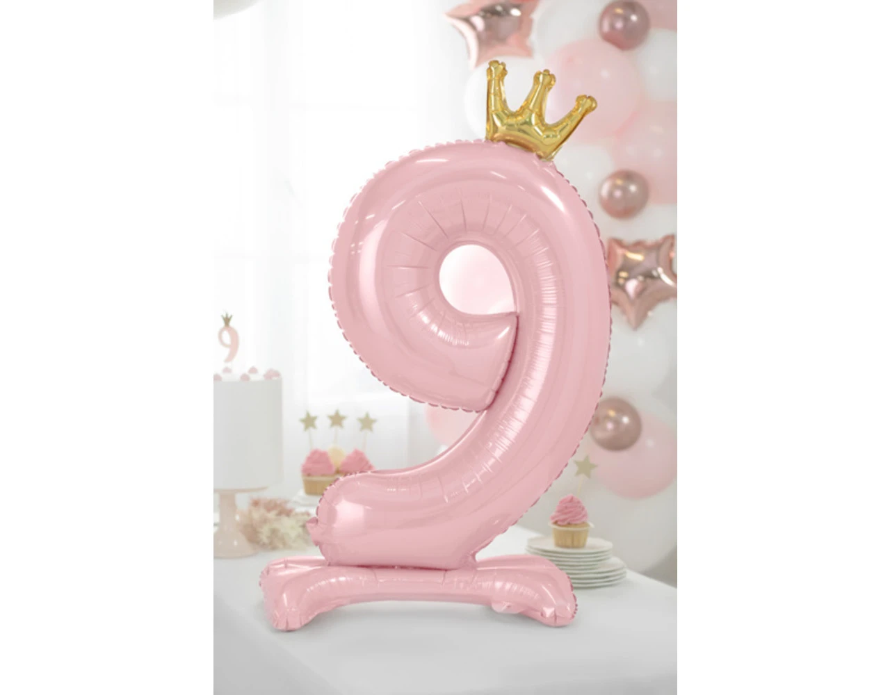 Staande, metallic folieballon Nummer ”9” in lichtroze kleur met een kroon in goudkleur, afmeting voor opblazen ca. 103 cm (40,5”), afmeting na opblazen 84 cm (33”). Opblazen met lucht.