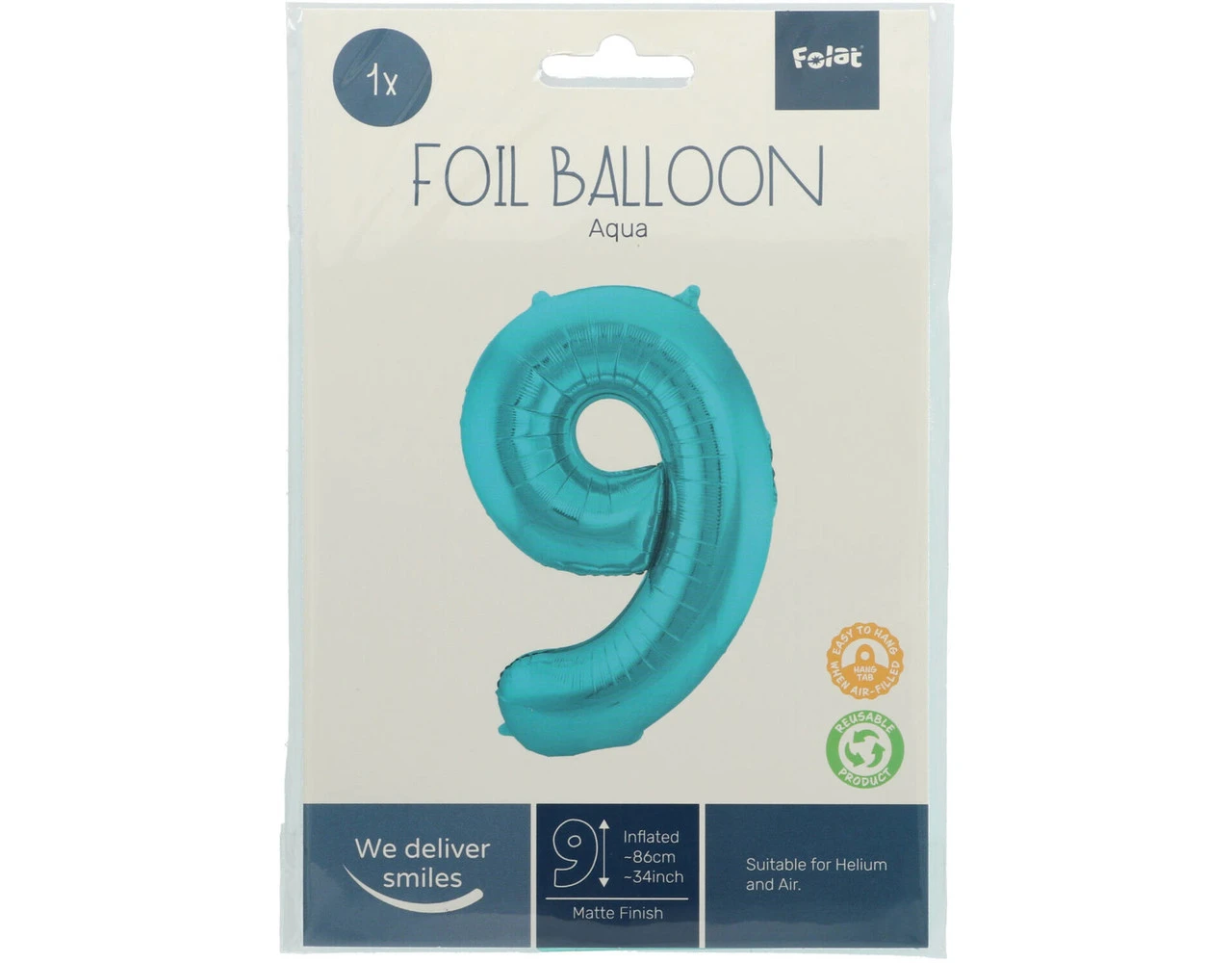 Folieballon Cijfer 9 Pastel Aqua Metallic Mat – 86 cm. Inhoud: 1 folieballon. Kleur: Blauw. Bijvoorbeeld te gebruiken tijdens de volgende feestgelegenheid/feestgelegenheden: Verjaardag, Kinderfeestje en Jubileum. Deze folieballon is 34 inch/86 cm. Het artikel is gemaakt van folie.