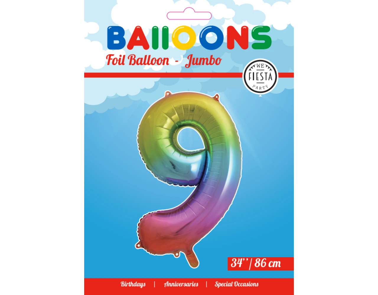 Verpakkingsinhoud: Folie Ballon Cijfer 9 Regenboog XL 86cm leeg