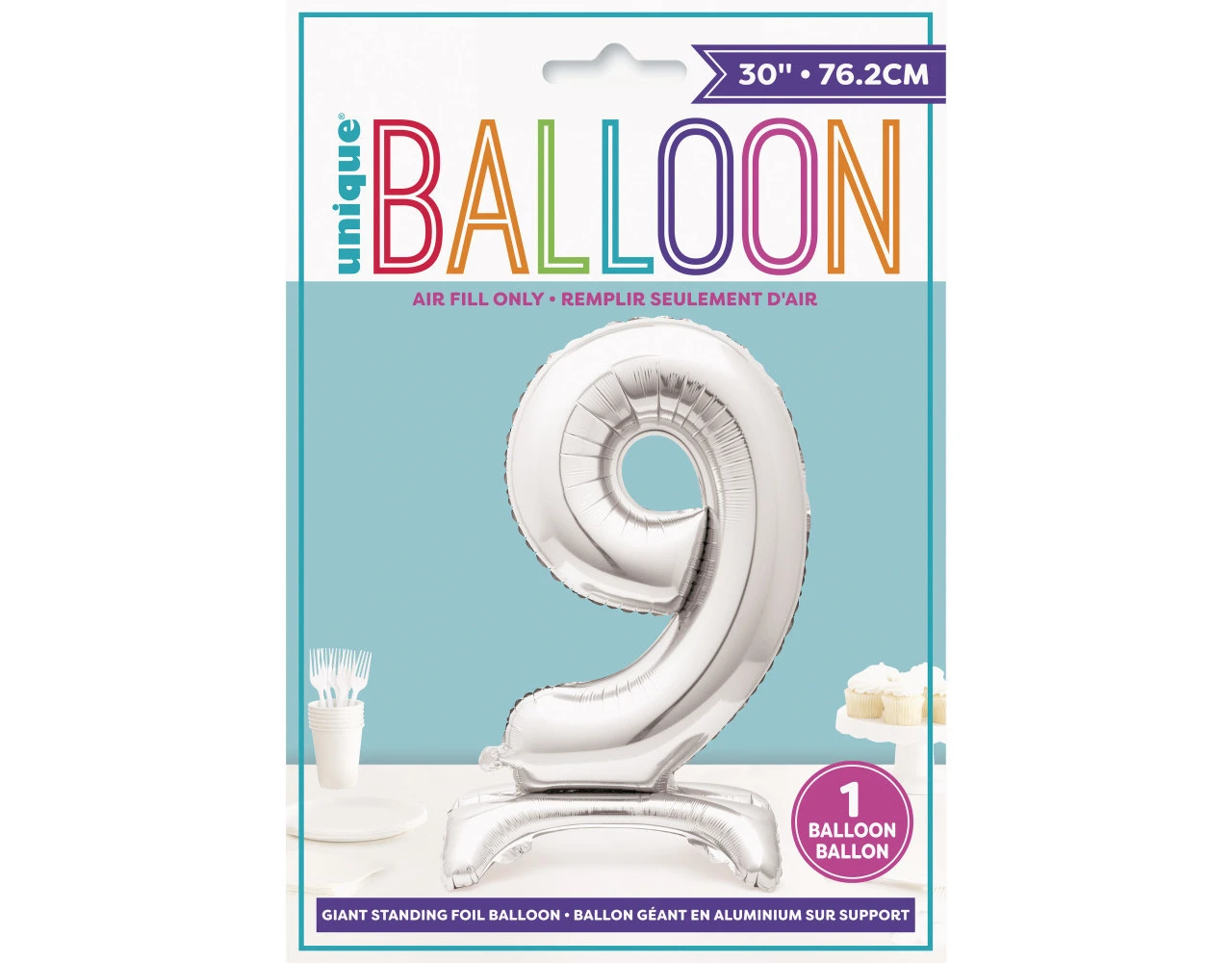 Verpakkingsinhoud: Folie Ballon Cijfer 9 Zilver met standaard 76cm