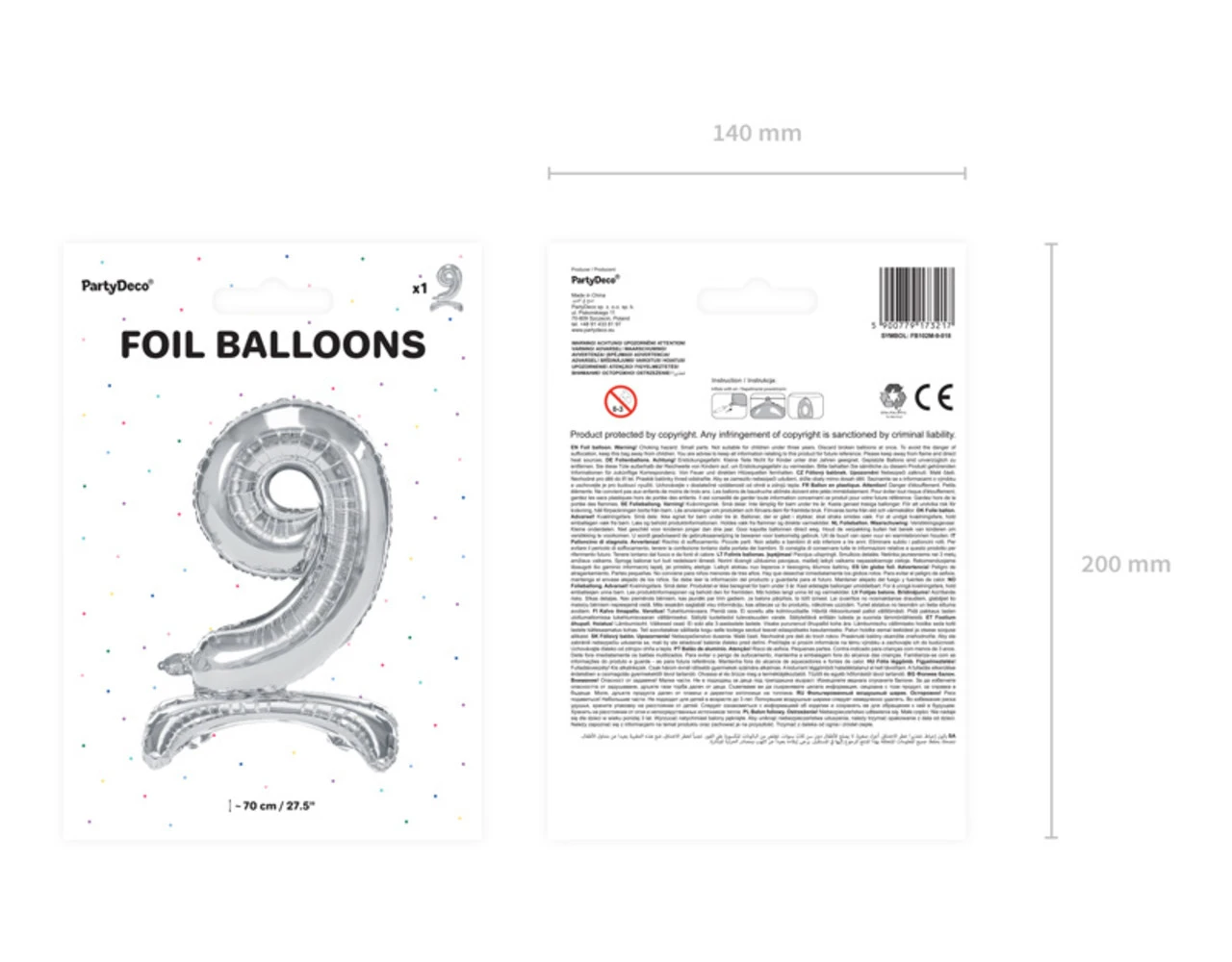 Metallic staande folieballon Nummer ”9” in zilverkleur, afmeting voor opblazen ca. 90 cm (35”), afmeting na opblazen ca. 70 cm (27,5”). Opblazen met lucht.