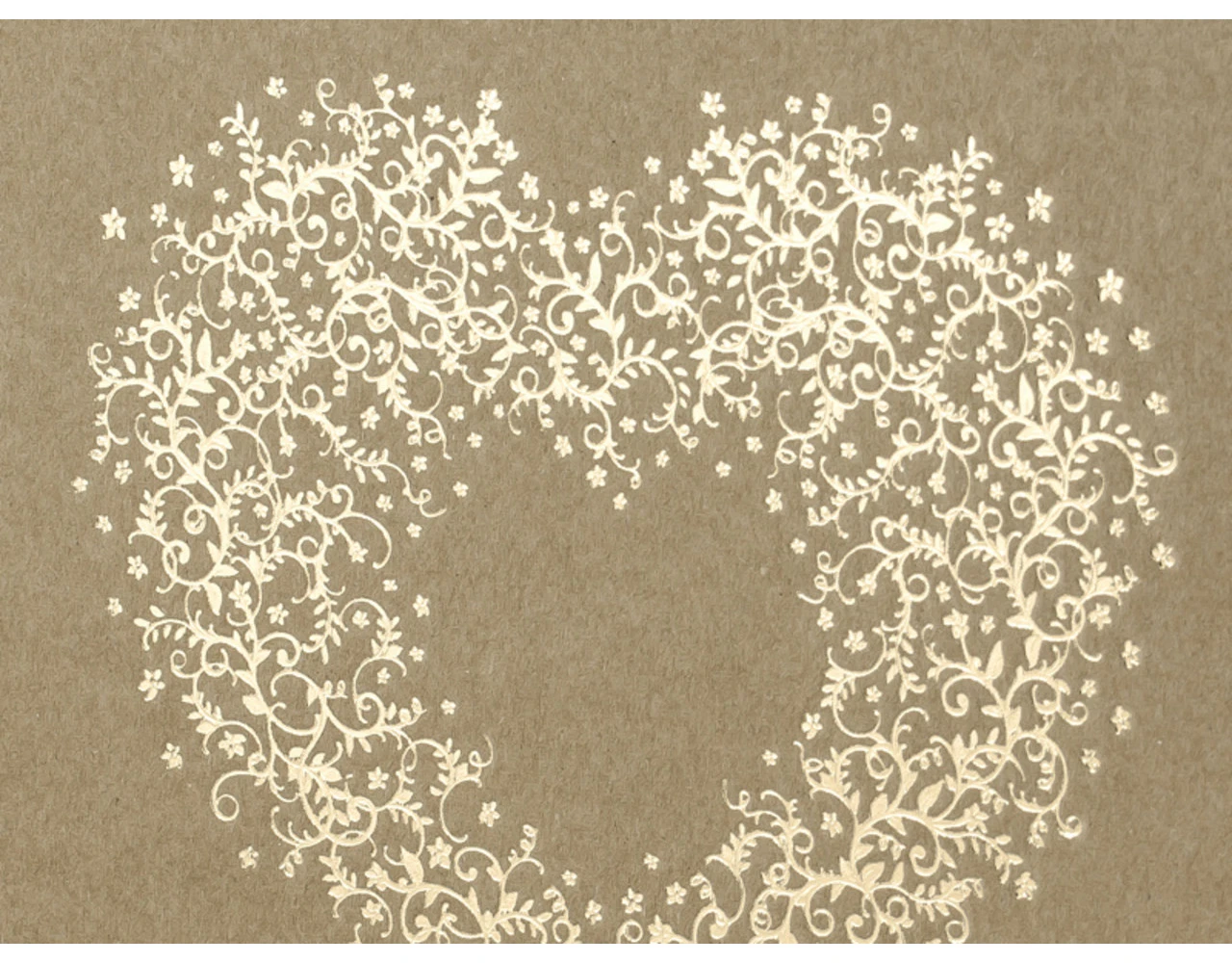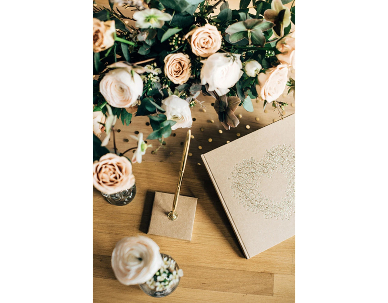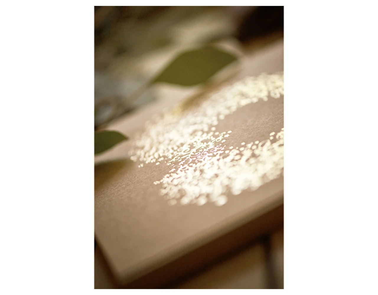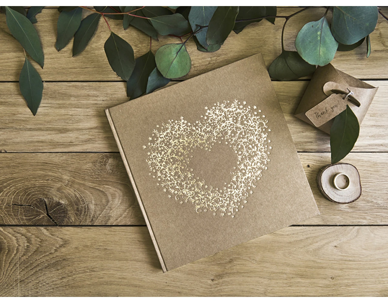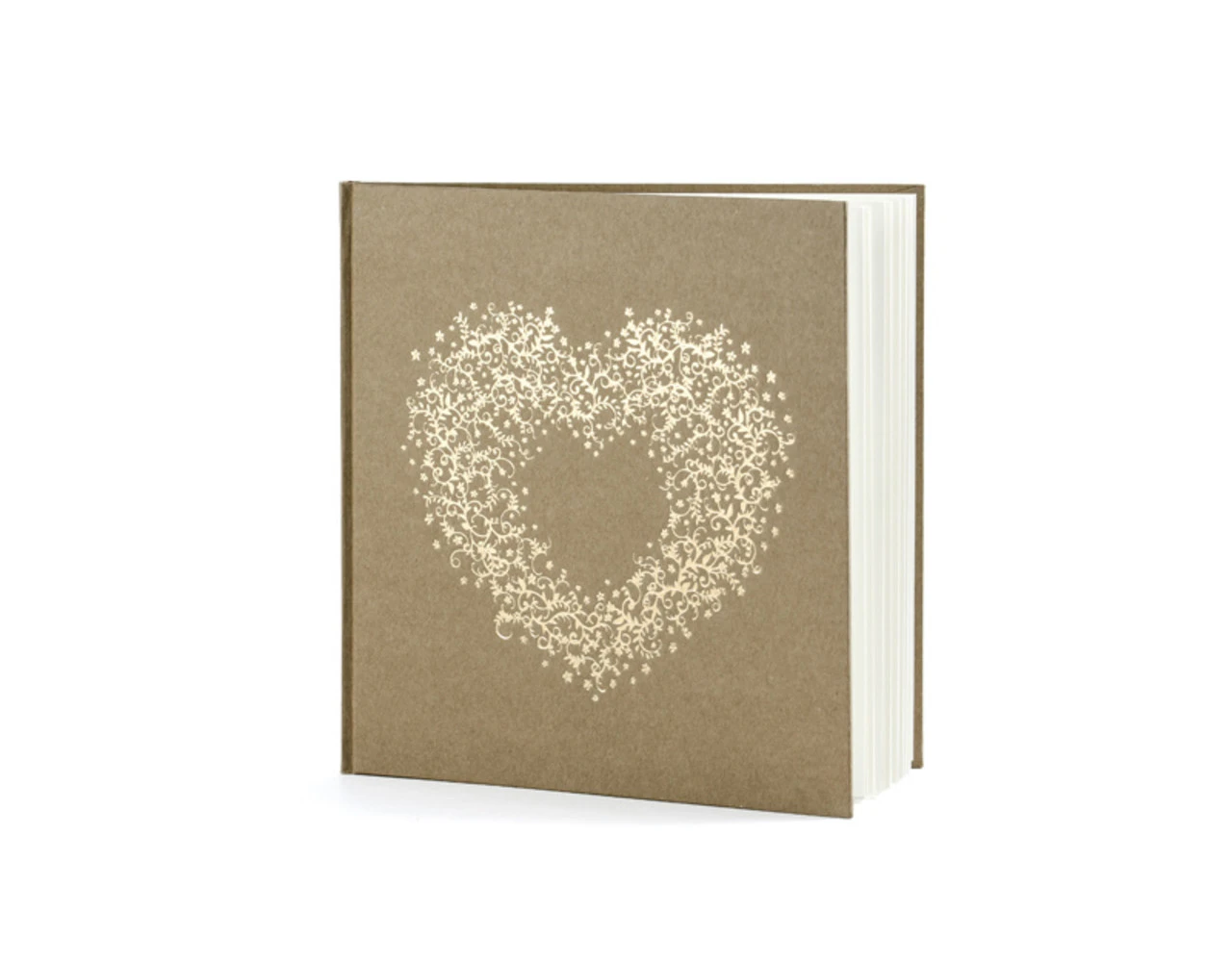 Gastenboek gebonden in kraftpapier met goudornament, formaat 20,5×20,5 centimeter, 22 pagina’s, zonder tekst.