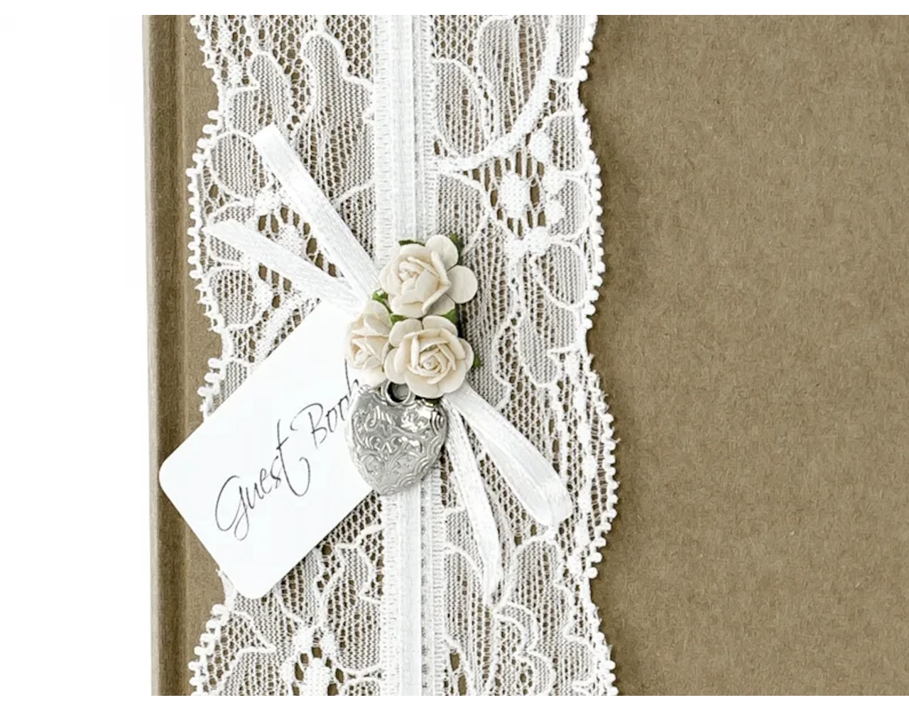 Gastenboek gebonden in kraftpapier met kant, lichtroze rozen, een hartvormige hanger en een inscriptie Gastenboek, Vintage Collectie, formaat 20,5×20,5 centimeter, 22 pagina’s.