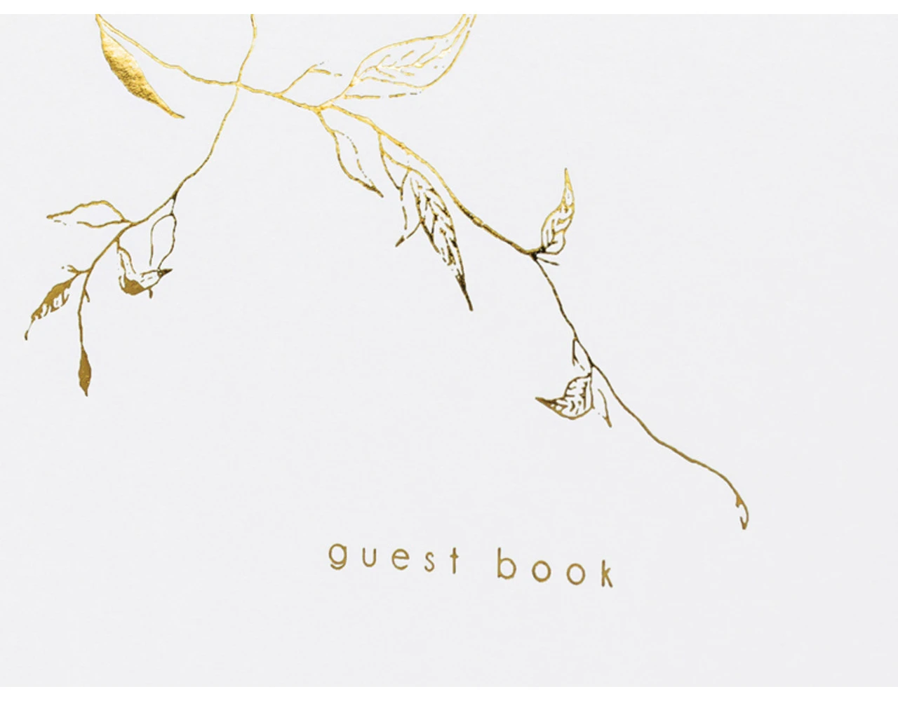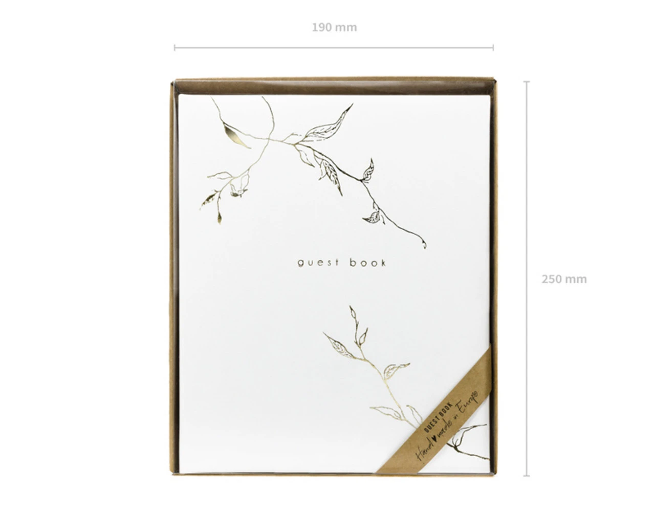 Gastenboek gebonden in wit papier met een goudkleurig motief, formaat ca. 20 x 24,5 cm 22 pagina’s, zonder tekst.